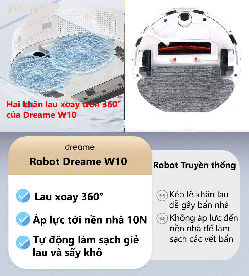 Dreame W10 có thể nói là cuộc cách mạng phá vỡ nhận thức về robot hút bút lau nhà truyền thống, W10 không chỉ sửa đổi đáng kể cấu trúc thiết kế hình dáng bên ngoài, mà còn trang bị lực hút siêu lớn 4000Pa, tốc độ quét cực nhanh, khả năng thích ứng với môi trường xung quang mạnh mẽ, đặc biệt là chức năng lau sàn nhà 360 độ giúp robot trở nên hoàn hảo, thậm chí còn thêm tính năng sấy khô sau khi giặt giẻ.