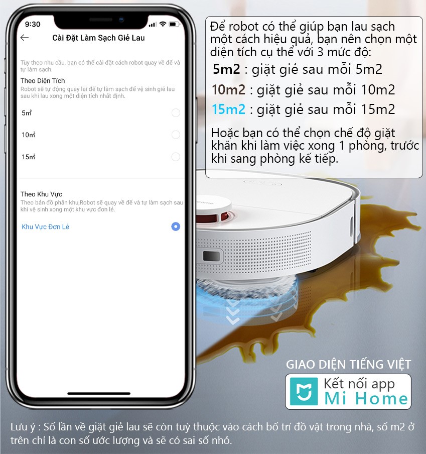 - Tự động trở về Dock sạc để làm sạch khăn lau