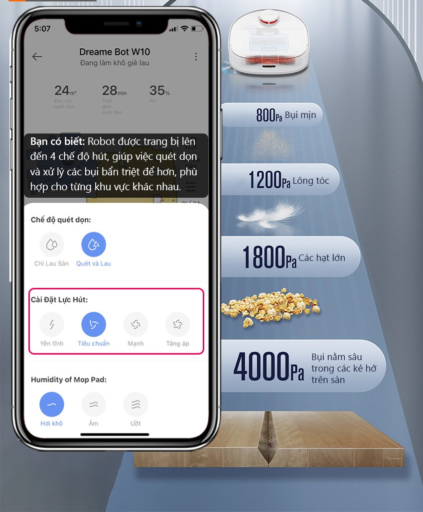 Điều chỉnh 4 chế độ hút và 3 chế độ lau