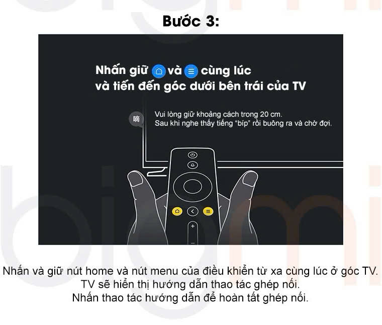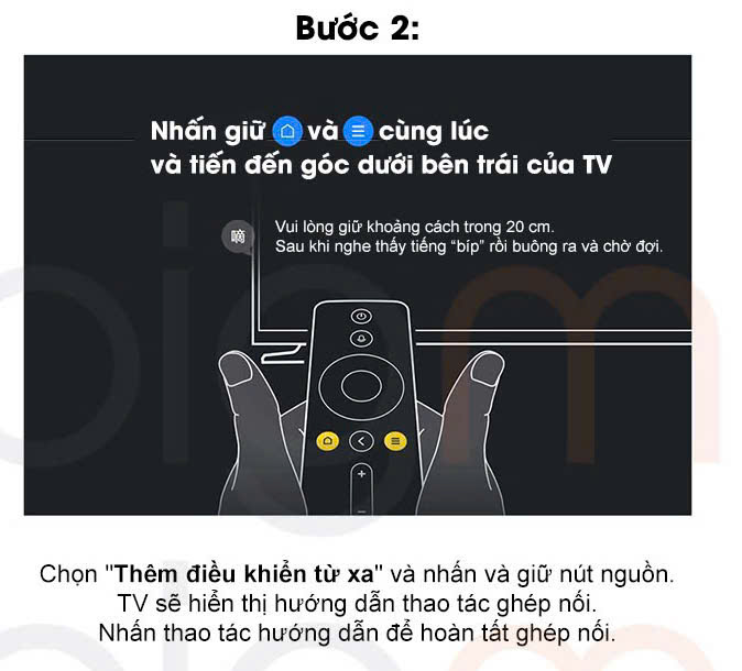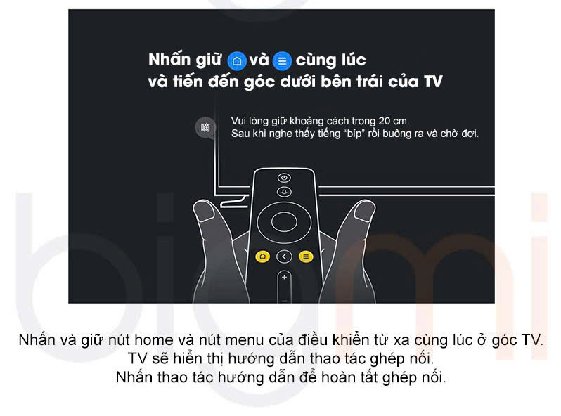 CÁCH SỐ 2: NHẤN VÀ GIỮ NÚT HOME + NÚT MENU CỦA ĐIỀU KHIỂN CÙNG LÚC TẦM 10-15s CẠNH GÓC TRÁI MÀN HÌNH TIVI KHOẢNG CÁCH TẦM 20CM ĐỂ KẾT NỐI
