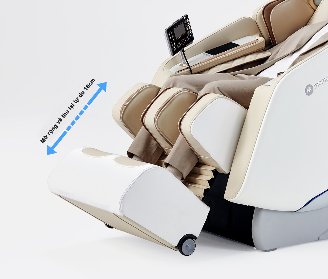 Phần tựa chân của ghế có thể được mở rộng và thu lại tự do 16cm để phù hợp với nhiều người dùng có chiều cao khác nhau từ 150-195cm. Từ đó giúp mọi người dùng đều có thể tận hưởng dịch vụ massage ở tư thế thư giãn nhất có thể mà không bị giới hạn về chiều cao.