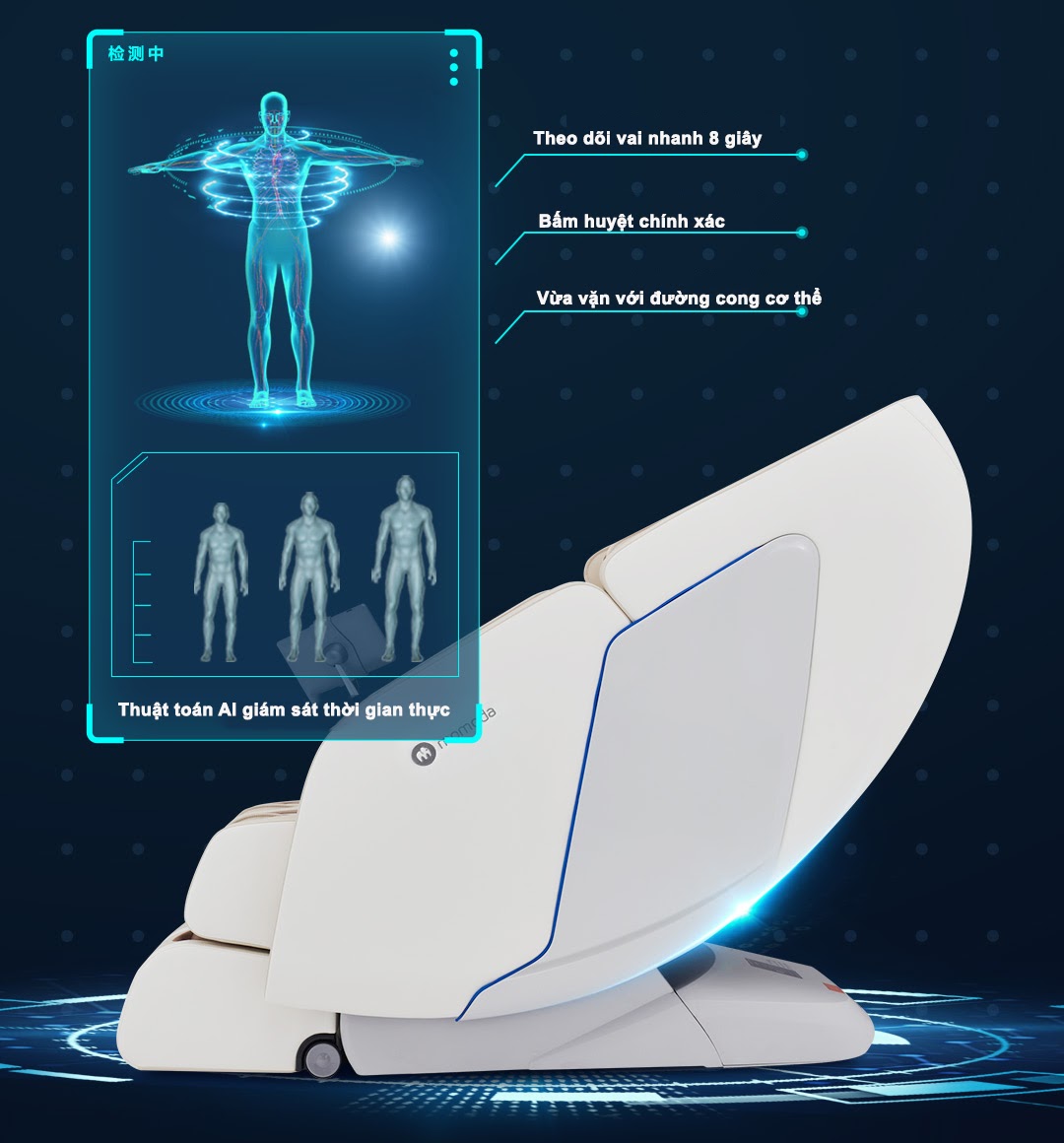 M810 là chiếc ghế massage đầu tiên sử dụng chuyển động thông minh kiểu kép và phát hiện vai thông minh. Cụ thể, chiếc ghế được đặc biệt sử dụng thuật toán AI thông minh để định dạng, xác định đúng vị trí các bộ phận cơ thể người, chỉ mất 8 giây để nhận ra các vị trí vai, đường cong cơ thể và vị trí chân ở mọi khía cạnh. Từ đó mang đến những quy trình massage riêng biệt, chính xác, đúng vị trí và thích hợp nhất cho từng cá nhân.