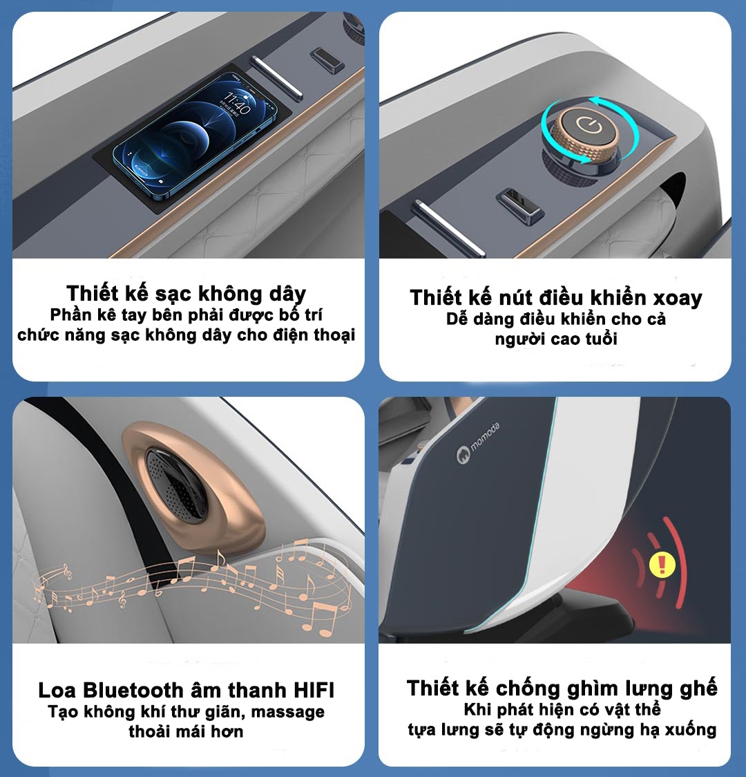 Ghế massage thông minh AI Momoda M810 sở hữu thiết kế viên nang phi thuyền hoàn toàn mới, bao bọc toàn diện cơ thể người từ đầu đến chân. Từ đó, không chỉ mang đến trải nghiệm massage toàn diện, cho tư thế nằm thoải mái và dễ chịu mà còn giúp mang đến vẻ ngoài vô cùng cao cấp và sang trọng cho không gian bố trí. Phần kê tay bên phải ghế còn được trang bị vị trí sạc không dây cho điện thoại vô cùng linh hoạt. Loa phát nhạc với chất lượng âm thanh HIFI mang đến sự thoải mái, xả stress hiệu quả hơn trong quá trình massage.