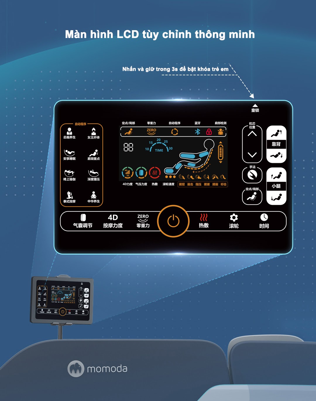 Màn hình cảm ứng LCD điều chỉnh thông minh cũng được tích hợp khá trực quan, cơ chế tùy chỉnh các thông số massage đa chiều, thích ứng với mọi đối tượng người dùng khác nhau. Nhấn và giữ phím 3s để kích hoạt chức năng khóa trẻ em, tránh trẻ vô tình chạm vào trong quá trình massage.