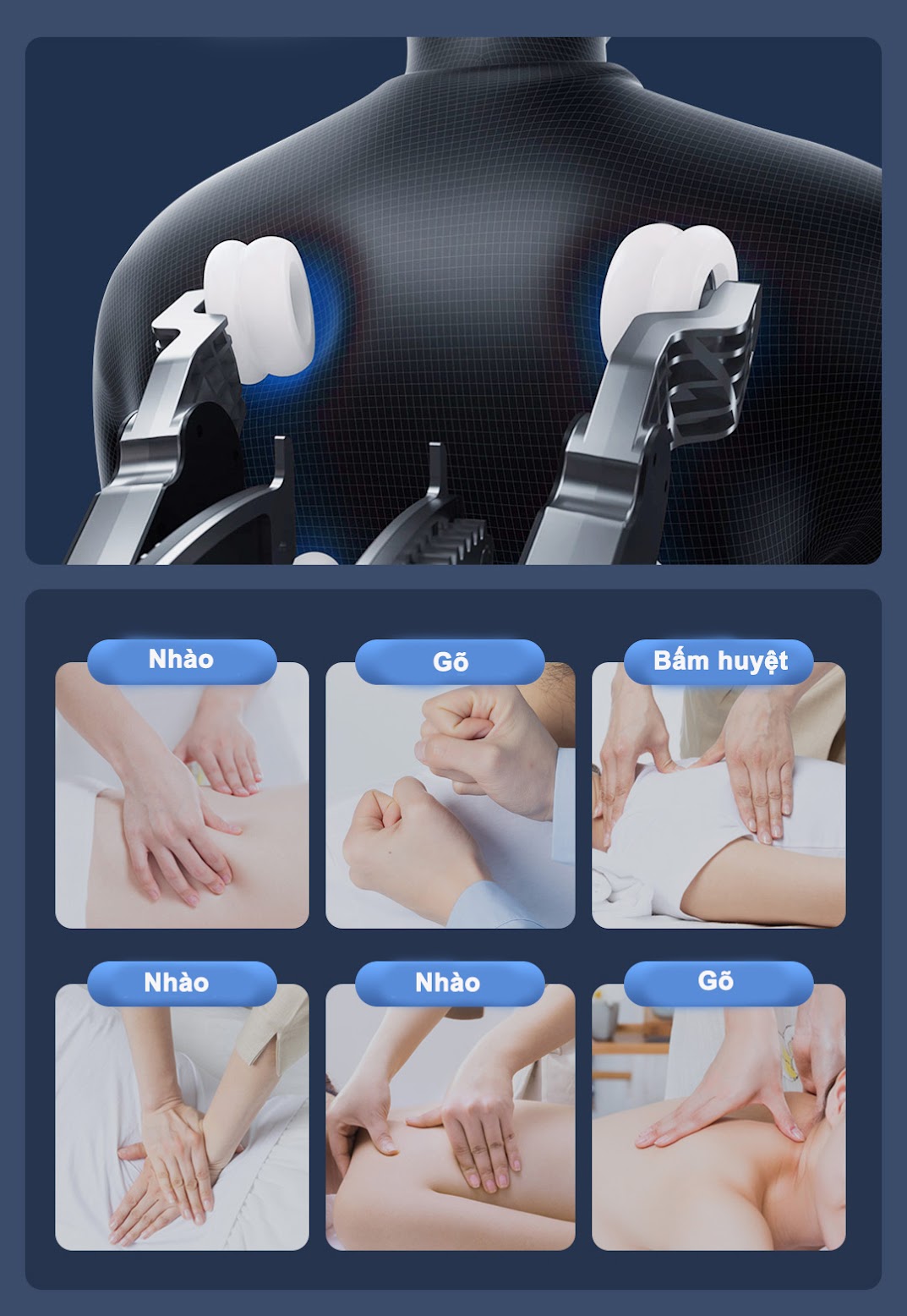 Đặc biệt, 4 đầu massage đàn hồi còn chuyển động linh hoạt với những động tác như nhào, gõ, bấm huyệt,...cùng các kĩ thuật chuyên nghiệp khác tác động như bàn tay thật của con người, giúp xua tan nhanh chóng những cơn đau nhức mệt mỏi thường trực trên cơ thể người.
