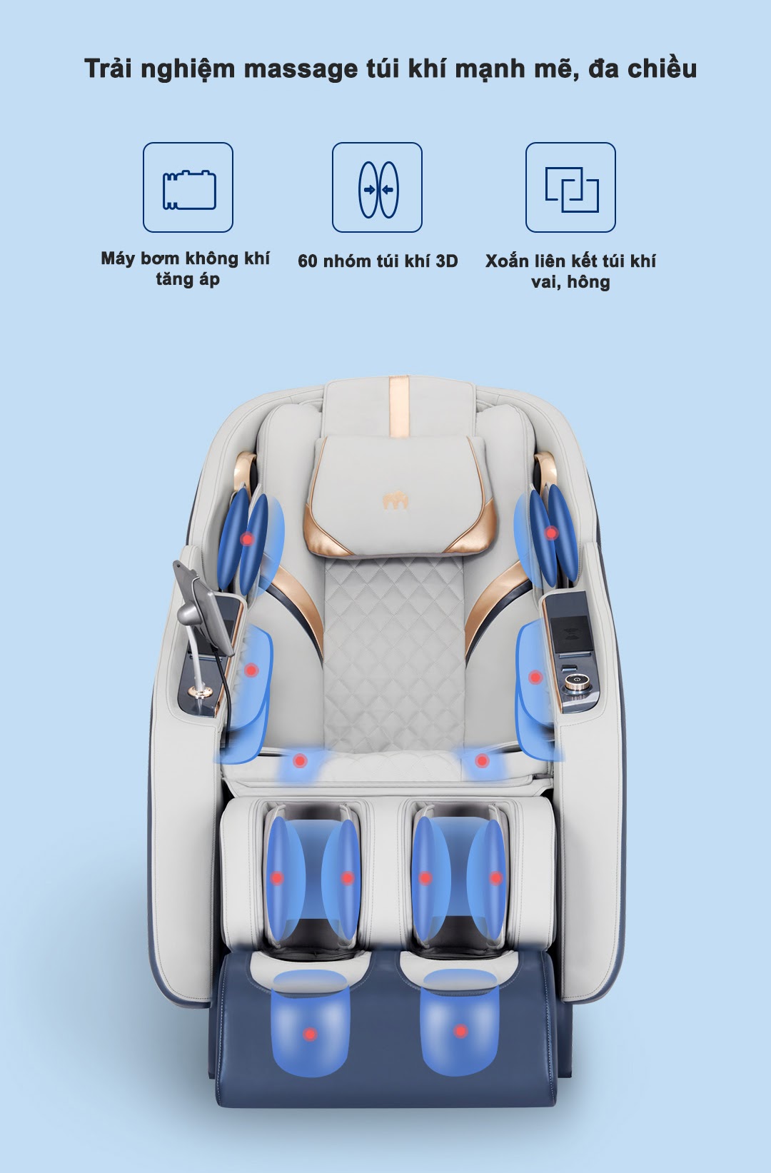 Ghế massage Momoda M810 được trang bị với 60 bộ túi khí 3D quấn quanh vai, tay, chân và bàn chân, bao phủ toàn bộ từ trên xuống dưới. Với cơ chế bơm tăng áp, giải phóng theo chu kì đồng thời vỗ nhẹ và nhào nặn giúp mang đến trải nghiệm massage mạnh mẽ, êm ái và đa chiều hơn.