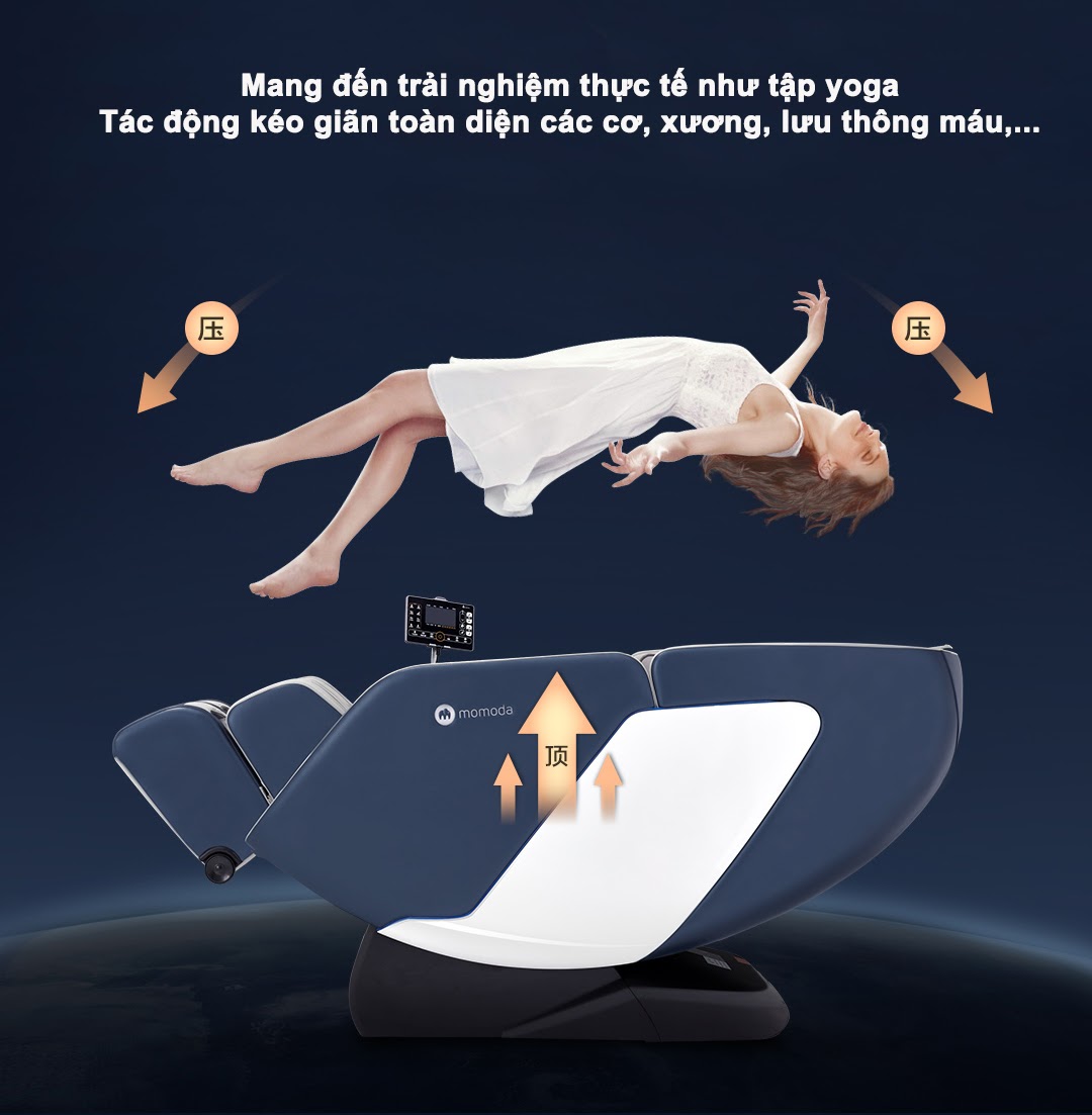 Ở chế độ massage kéo dãn yoga, phần tựa lưng và bắp chân của ghế massage đồng thời được ấn xuống, phối hợp với túi khí hông ấn vào. Từ đó mang đến hiệu quả kéo giãn toàn diện các cơ và xương của toàn thân, kích thích hiệu quả các mô liên kết, lưu thông máu cổ, tĩnh mạch giống như trải nghiệm tập yoga thật cho người dùng.