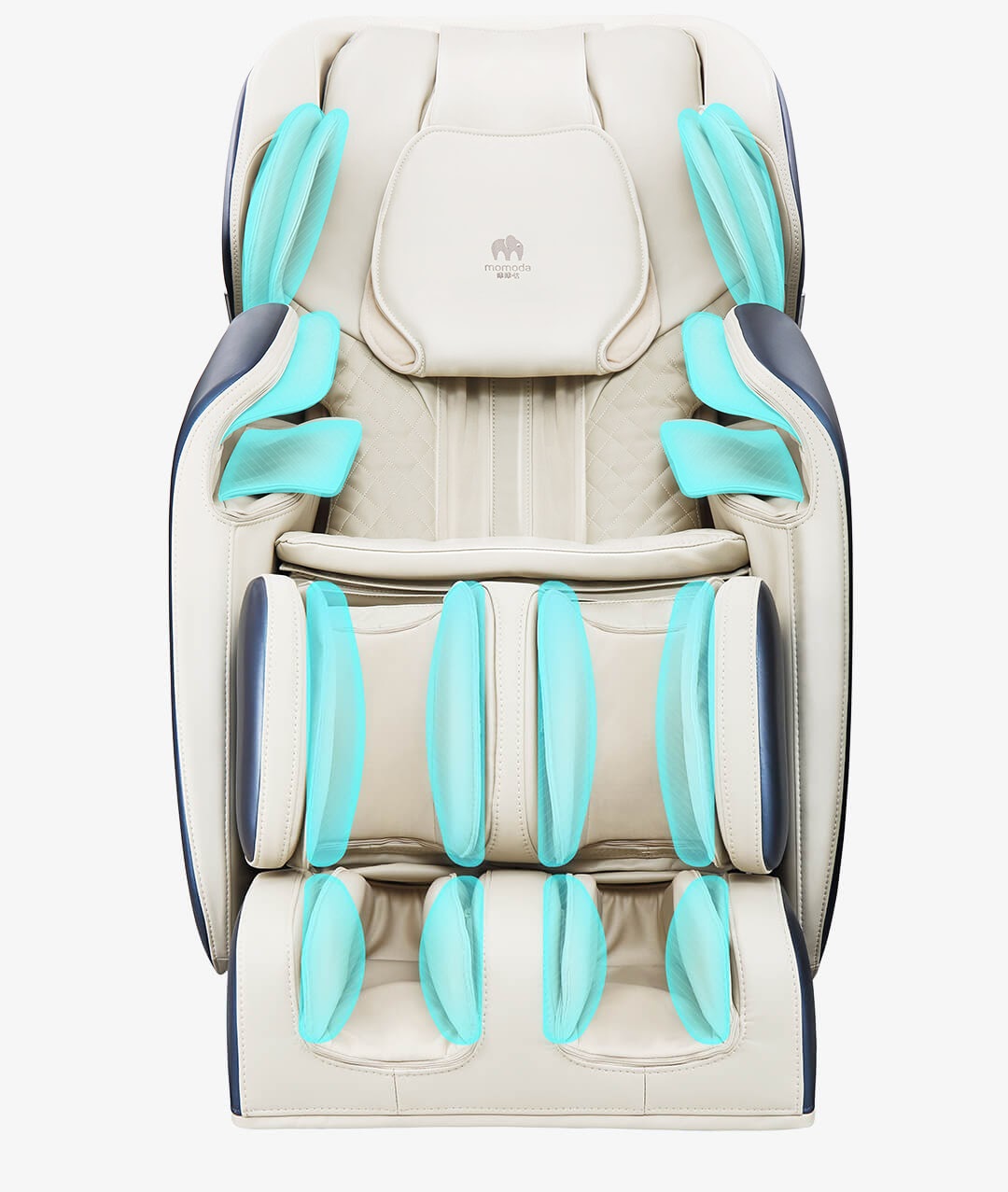 30 túi khí 3 chiều được bố trí đều khắp ghế massage. Túi khí được thổi phồng và ép theo một chu kỳ nhẹ nhàng tác động vào từng vị trí trên cơ thể theo cơ chế di chuyển của túi. Người dùng có thể dễ dàng cảm nhận được các động tác vỗ nhẹ, nhào nặn từ đó giúp giảm áp lực, căng thẳng cả về thể chất và tinh thần hiệu quả