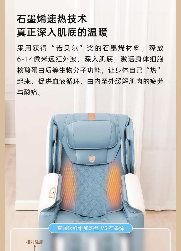 Tất nhiên, điểm mạnh của ghế massage Joypal không chỉ có vậy. Để mang lại hiệu quả massage cao hơn cho người dùng, Joypal sử dụng vật liệu graphene từng đoạt giải “Nobel” để phát ra sóng hồng ngoại xa 6-14 micron, tác động sâu vào các cơ. Ở phía dưới, nó kích hoạt các chức năng của các phân tử sinh học như axit nucleic và protein trong các tế bào của cơ thể, để cơ thể “ấm lên”, thúc đẩy tuần hoàn máu và giảm mệt mỏi và đau nhức cơ bắp từ trong ra ngoài.
