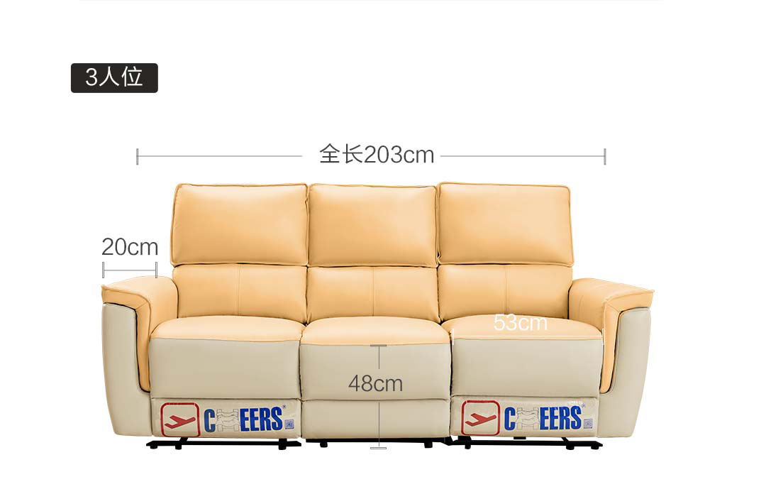 Về thiết kế, ghế Sofa điện Cheers sử dụng thiết kế dành cho ba người ngồi, kích thước của nó là 224 cm x 95cm x 99cm. Tựa lưng được làm bằng bông khá dày có thể mang lại trải nghiệm êm ái cho người dùng khi tựa lưng. Ngoài ra, phần ke tay được thiết kế nghiêng vào bên trong và khá dày nên người dùng không cần dùng đến gối.