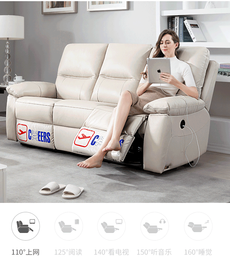 Điều đặc biệt không thể không nhắc tới đó chính là bên ngoài tay vịn của sofa điện Cheers còn được trang bị một ổ cắm USB có thể kết nối với cáp dữ liệu để sạc máy tính bảng, điện thoại di động và các thiết bị khác. Thật tiên lợi khi bạn vừa có thể sạc điện thoại của mình vừa có thể thư giãn, tất cả những gì bạn phải làm đó là cắm điện thoại, laptop vào cổng USB và tiếp tục tận hưởng việc thư giãn của mình.