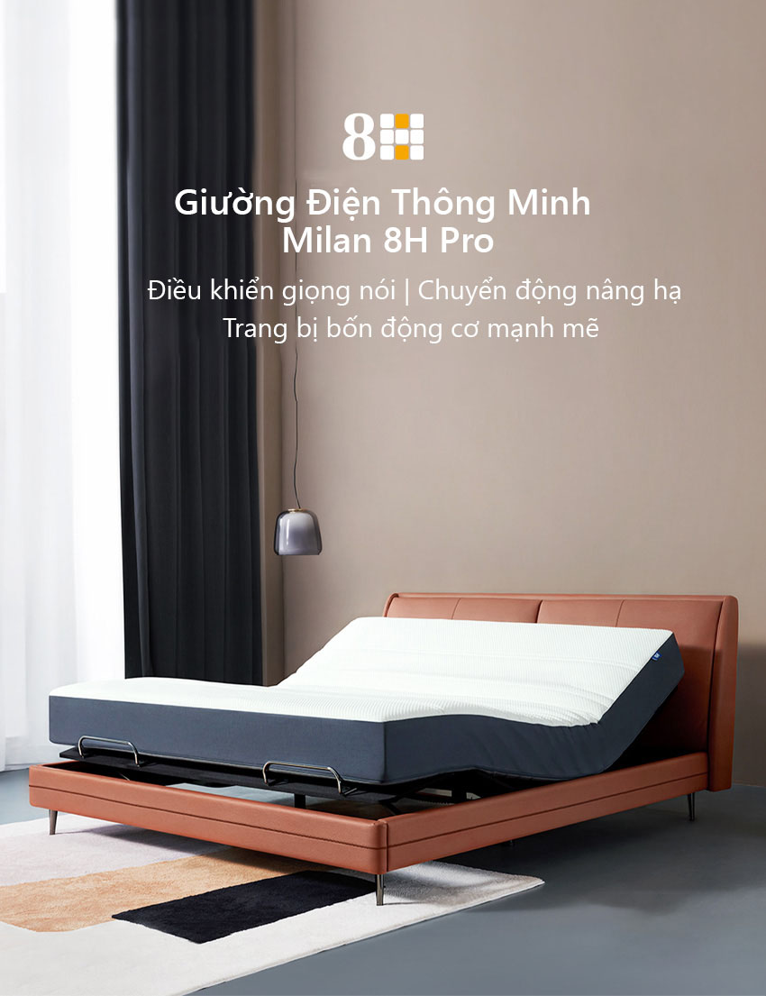 8H Milan Pro có lò xo cứng, hỗ trợ điều khiển bằng giọng nói thông minh. Về mặt thiết kế, giường có phần chân cao khoảng 14cm và đệm lò xo cải tiến làm từ chất liệu chắc chắn, phần bao quanh giường làm từ chất liệu da kỹ thuật vải (chống nước, chống dầu, chống bó, kết cấu tương thích tương đương da thật), phù hợp với thói quen ngủ của người dùng. Nệm hỗ trợ hoạt động lên hầu hết các bộ phận khác nhau của cơ thể, tạo áp lực phù hợp ở mọi vị trí.