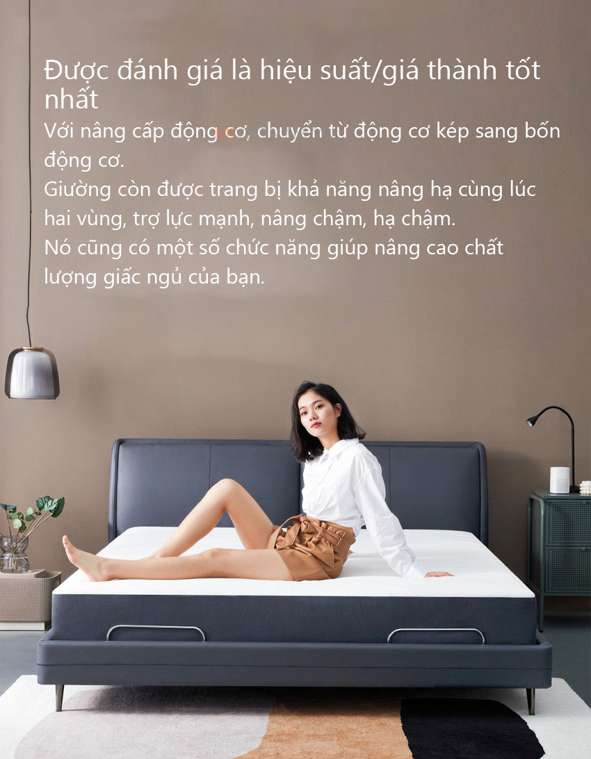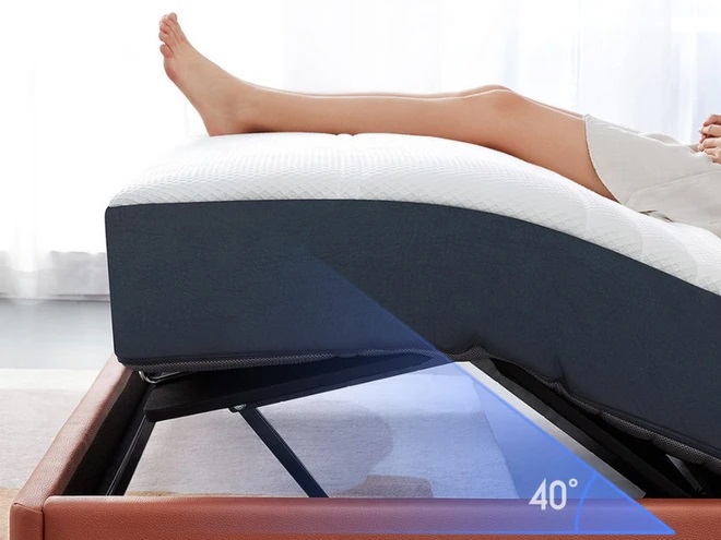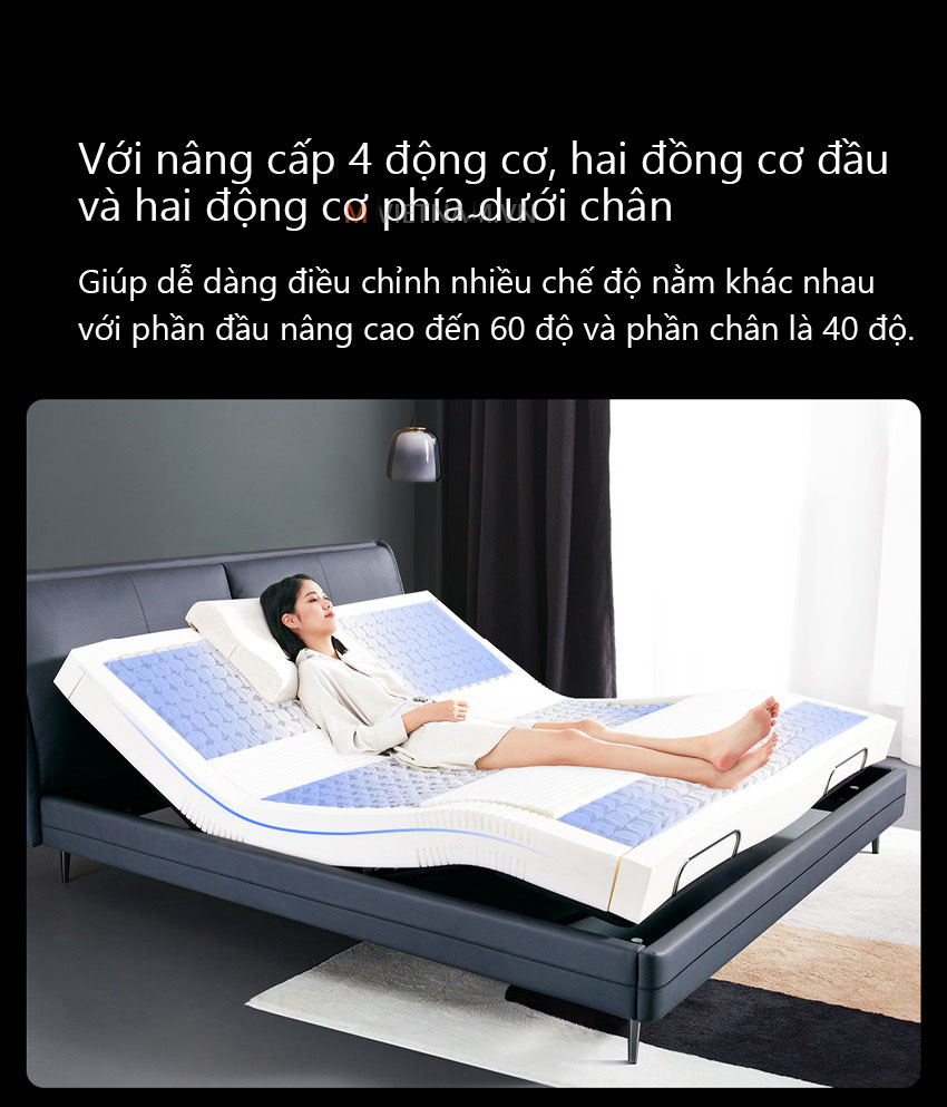 Giường điện thông minh có thể được thiết lập theo nguyên tắc công thái học, điều chỉnh đầu, cột sống thắt lưng, đầu gối và các góc khác nhau, vách ngăn nâng đôi cho phép bạn định vị tựa lưng 60 độ, chân 40 độ và rất nhiều vị trí khác.