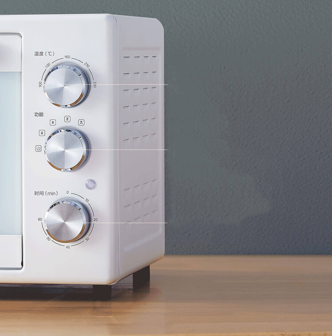 Lò nướng điện Viomi áp dụng thiết kế núm cơ vật lý và cách sử dụng khá đơn giản so với các sản phẩm khác trên thị trường. Lò nướng gồm 3 núm vặn. Theo thứ tự từ trên xuống, núm vặn đầu tiên để lựa chọn nhiệt độ nướng phù hợp trong khoảng từ 100ºC đến 230 ºC. Núm vặn thứ hai dùng để lựa chọn chế độ nướng, gồm 4 chế độ: tắt/ nướng trên/ nướng dưới/ nướng cả trên và dưới + xiên quay. Và núm điều chỉnh cuối cùng để lựa chọn thời gian nướng trong 60 phút. Với núm vặn vật lý cho phép người dùng điều chỉnh bằng tay giúp kiểm soát nhiệt độ và thời gian dễ dàng hơn.