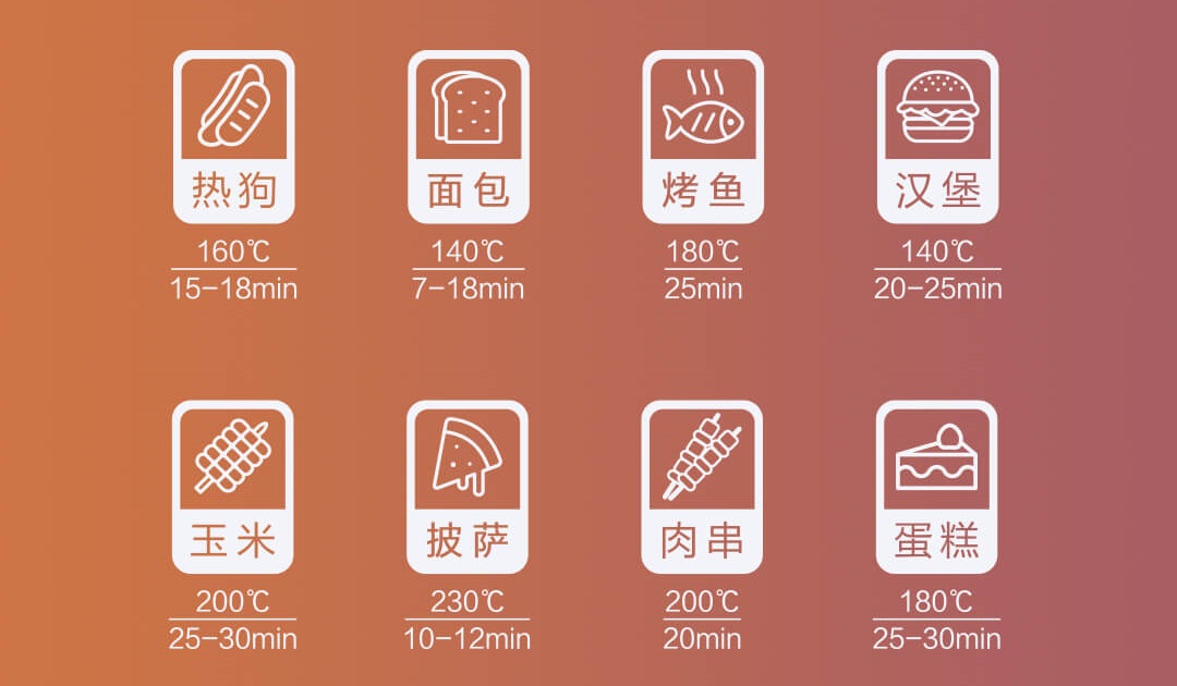 Hướng dẫn sử dụng: làm nóng lò trước 3 phút, cho thức ăn vào lò nướng, bắt đầu nướng. Nhiều người chỉ sử dụng lò nướng mà bỏ qua bước làm nóng lò trước. Làm nóng lò sơ bộ có thể được sử dụng để khử trùng và giúp lò có thể đạt được nhiệt độ cần thiết trước, điều này có lợi cho việc làm nóng đồng đều thực phẩm, cải thiện tỷ lệ nướng thành công.