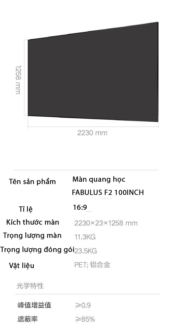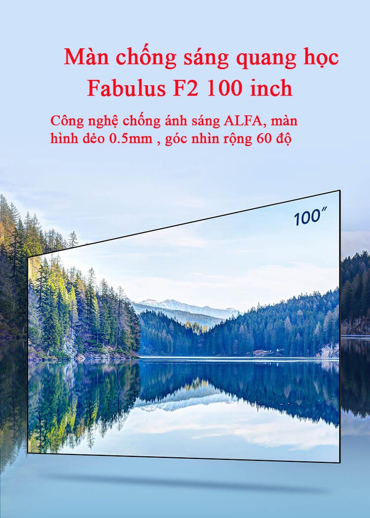 XIAOMI fengmi FABULUS F2 với Công nghệ Fengmi đã thiết kế màn hình quang học 100 inch laser, nó được trang bị Công nghệ 3.0 ALPD, cung cấp chi phí sản xuất thấp và hiệu suất cao, độ tương phản cao và không có điểm màu. FANULUS F2 được sử dụng tấm quang siêu mỏng từ 9 mm gồm các 8 lớp phim quang học, tái diễn một bức tường trắng cổ điển, FABULUS F2làm tăng độ tương phản của ánh sáng xung quanh, thực tế thành một vùng tối trên 98%, cho chất lượng hình ảnh tuyệt vời, sử dụng công nghệ chống ánh sáng ALFA, cho góc nhìn siêu rộng lên đến 60 độ