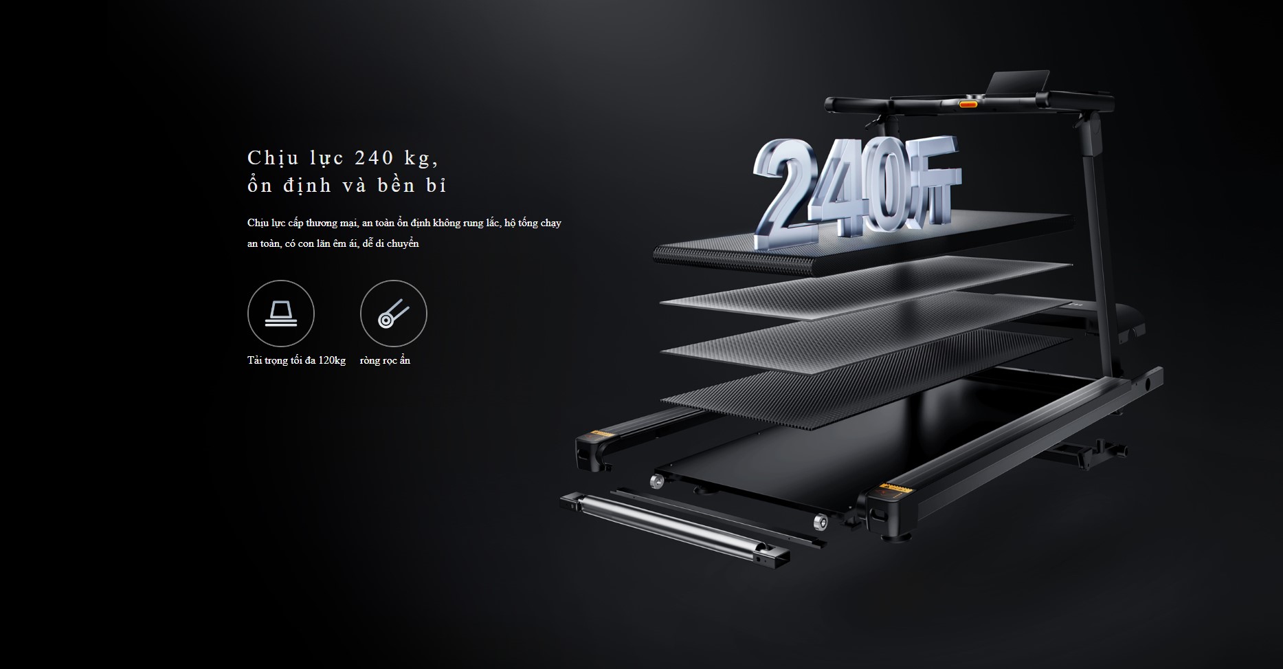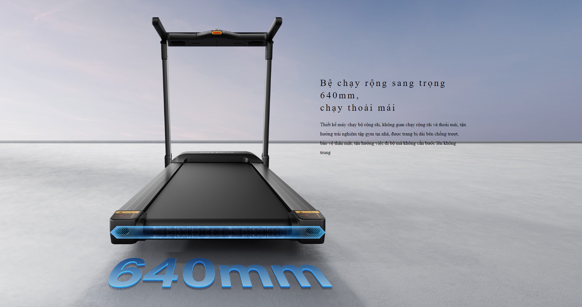 Phạm vi vùng chạy được thiết kế rộng rãi với kích thước 640mm để người dùng thoải mái tập luyện tại nhà. Bên cạnh đó còn đi kèm với dải bên chống trượt, giúp giảm tối đa nguy cơ vấp ngã, cho khả năng chịu tải lên đến 120kg đảm bảo an toàn cho mọi người dùng