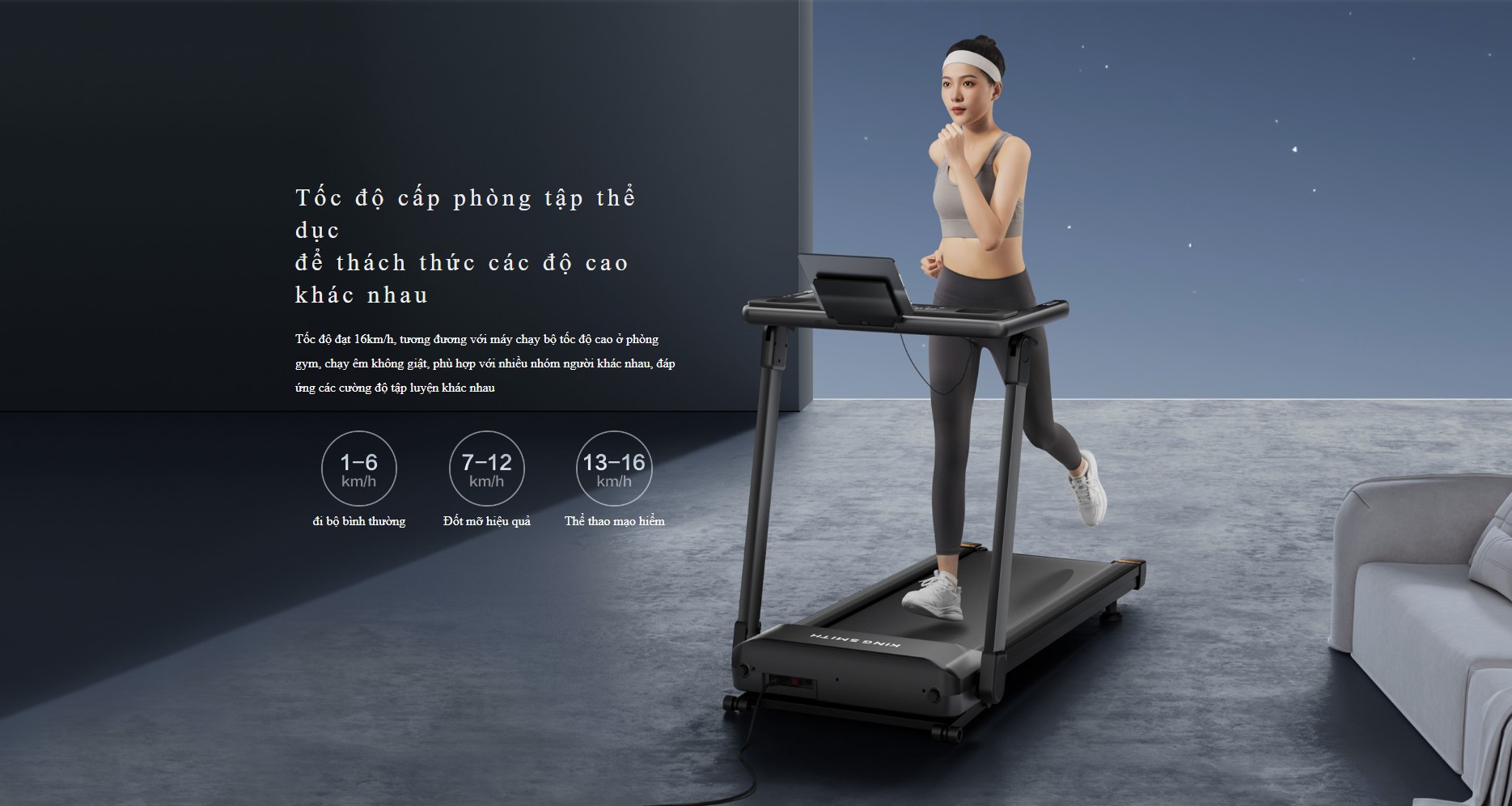 Máy chạy bộ gấp gọn KingSmith K20S có tốc độ chạy tối đa lên tới 16km/h, tương đương với máy chạy bộ tốc độ cao ở phòng GYM, chạy êm ái không giật, phù hợp với nhiều nhóm người khác nhau, đáp ứng các cường độ tập luyện khác nhau. 3 chế độ hỗ trợ được tích hợp, bao gồm: chế độ đi bộ 1-6km/h, chế độ đốt mỡ 7-12km/h và chế độ thể thao 13-16km/h, để người dùng thoải mái điều chỉnh tốc độ phù hợp với khả năng tập luyện của mình.