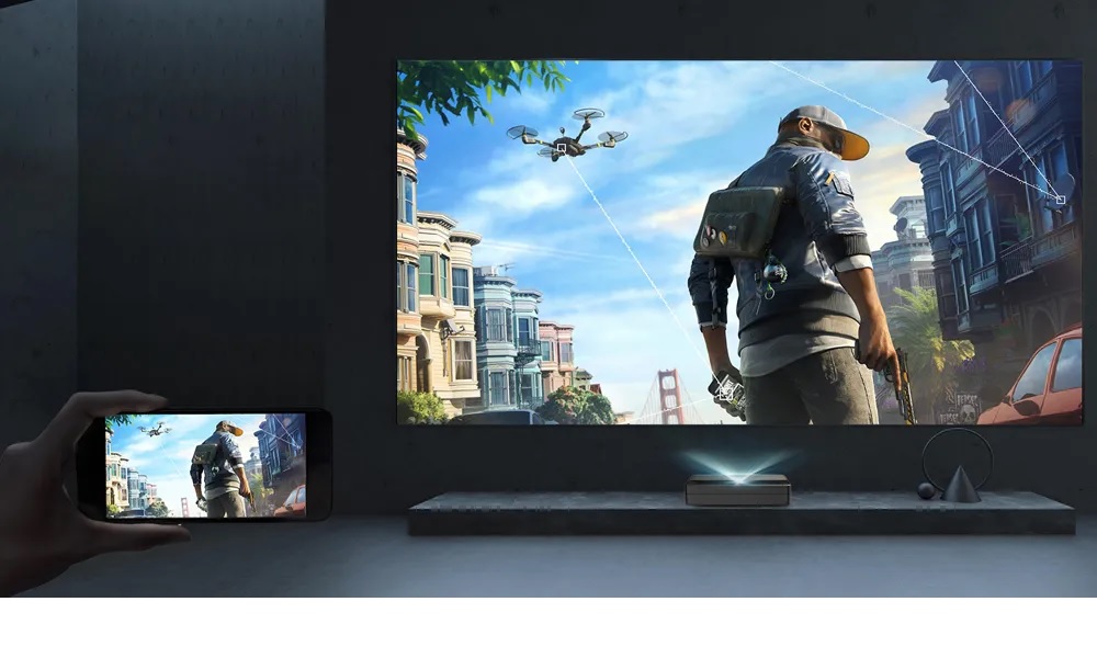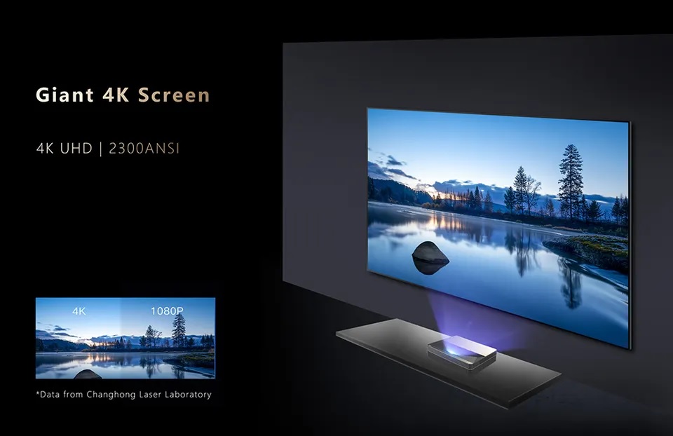 Độ phân giải 3840*2160 UHD hiển thị mọi chi tiết đẹp trên màn hình khổng lồ, độ sáng 2300ANSI lumens mang lại trải nghiệm xem phù hợp cho mắt người.