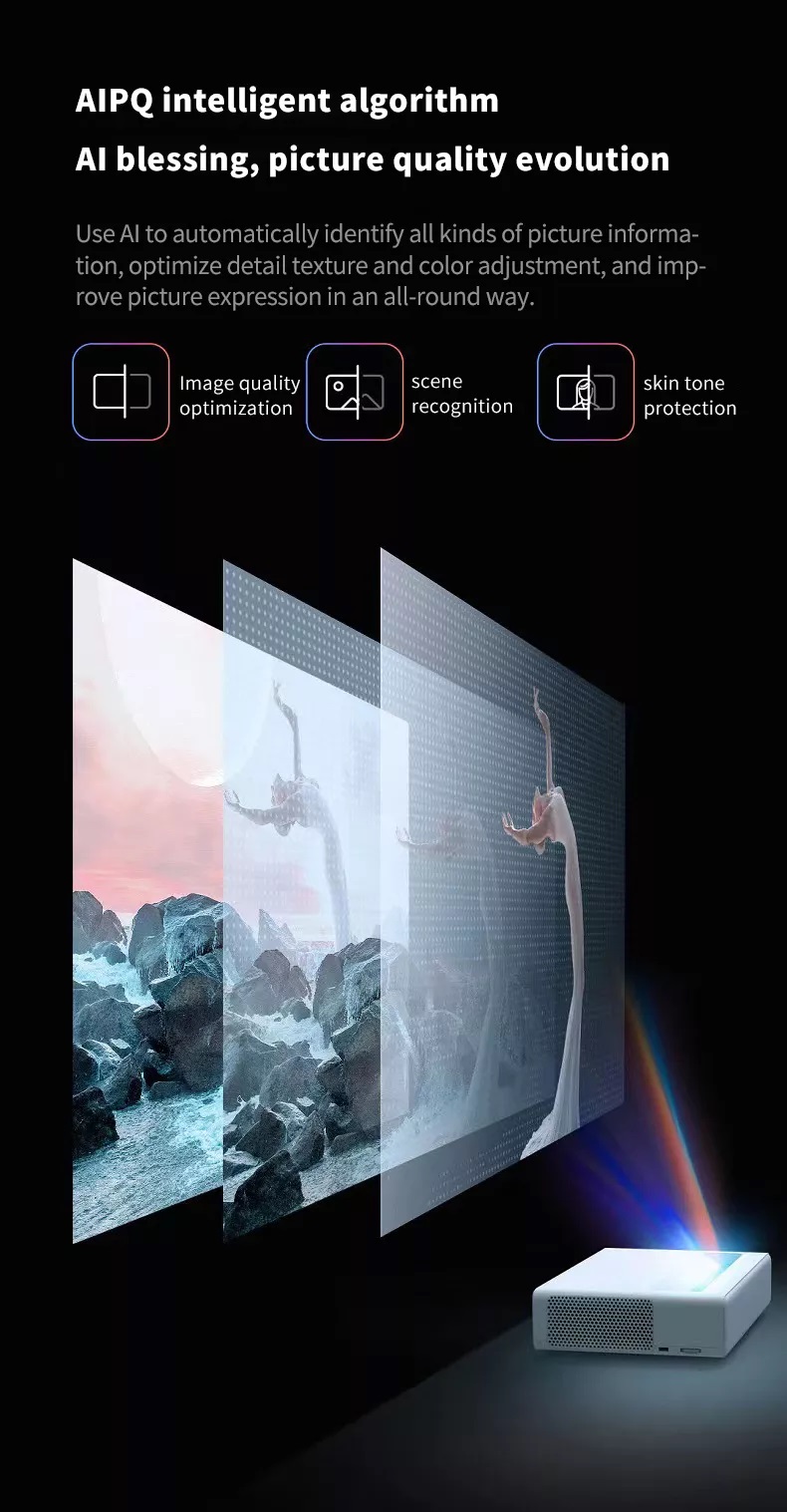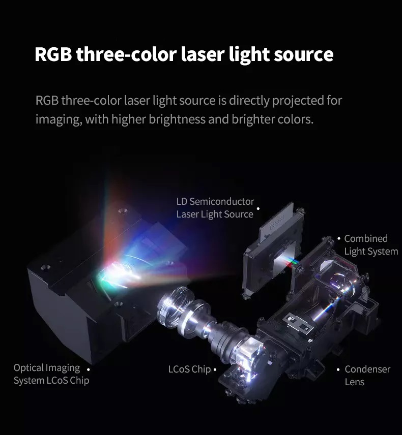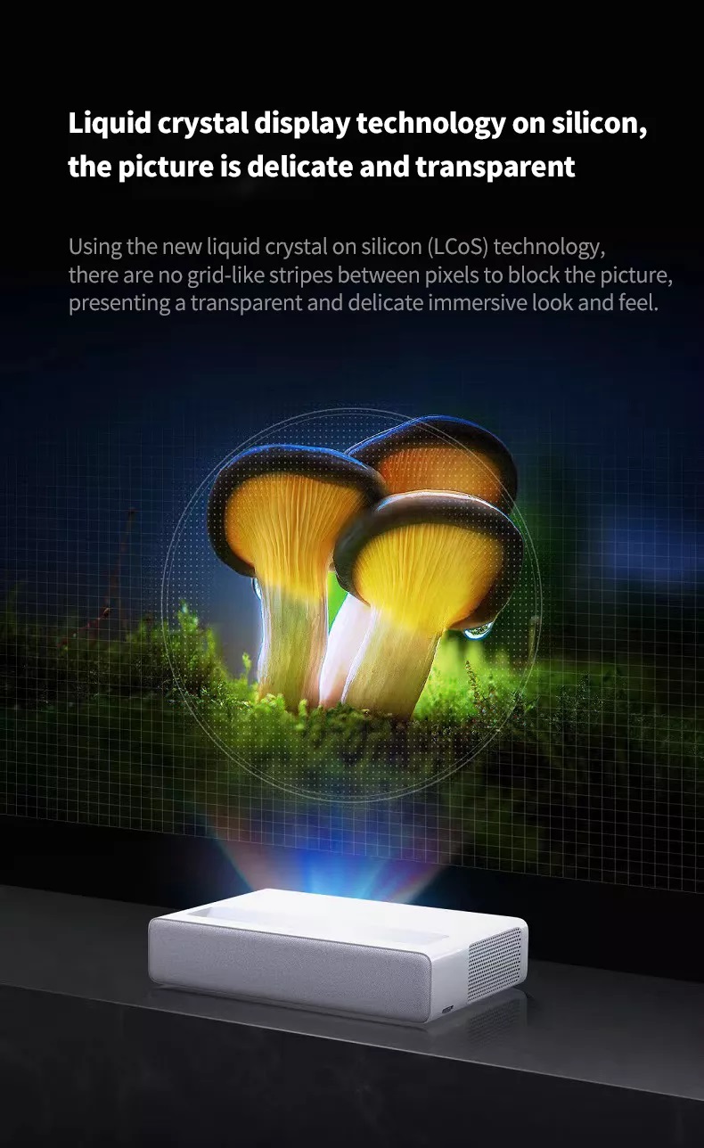 Máy chiếu gần xiaomi laser Cinema full color,Áp dụng công nghệ màn hình LCOS, giúp hình ảnh chiếu trở nên tinh tế và tự nhiên hơn; Về độ sáng, nó đạt 1400 ANSI lumen, giúp thiết bị có nhiều khả năng chống lại ánh sáng xung quanh và nó cũng có thể chiếu sáng minh dưới tác động của ánh sáng. Về độ phân giải, độ phân giải mã hóa tiêu chuẩn là 1080P, có thể đáp ứng nhu cầu xem màn hình lớn của người dùng. Về màu sắc, cơ bản nguồn sáng laser màu được sử dụng để làm cho hình ảnh có nhiều màu sắc hơn.