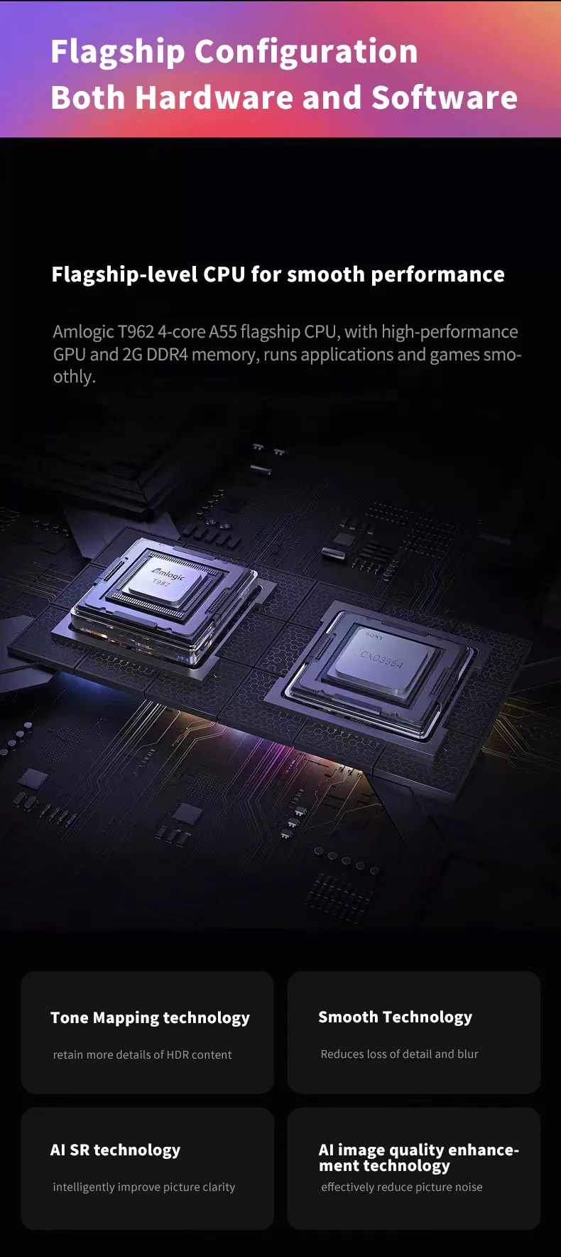 Máy chủ được xử lý chip Amlogic T982 có đặc tính hiệu suất cao và tiêu thụ điện năng thấp, đảm bảo thiết bị hoạt động trơn tru; Về dung lượng lưu trữ hệ thống, nó sử dụng kết hợp lưu trữ 2G + 16G để hỗ trợ xem phim và chương trình truyền hình trực tuyến.