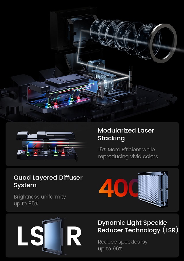 Với 9 chế độ sáng được áp dụng cho cơ sở ánh sáng nhỏ gọn chưa từng có, đây là một bước đột phá lớn của công nghệ laser giúp nâng cao tiêu chuẩn về độ sáng, với màu sắc vượt xa các nguồn đèn LED và laser khác đồng thời đạt được hiệu quả tốt hơn các nguồn laser ba màu khác.