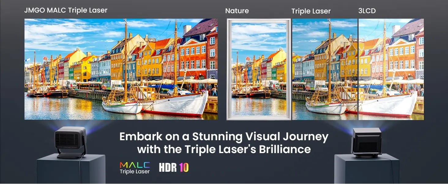 Máy chiếu 4K JMGO N1S Ultimate có độ phân giải 4K 3-Laser, Với công nghệ Triple Laser tiên tiến, máy chiếu mang lại hiệu suất đỉnh cao tổng thể với tỷ lệ tương phản 1600:1, độ chính xác màu ΔE<1, gam màu 110% Rec. 2020 và độ sâu màu 10 bit cho hình ảnh tuyệt đẹp, chân thực. Máy chiếu 4K JMGO N1S Ultimate có độ sáng tối đa 3500 ANSI lumen mang đến chất lượng hình ảnh vượt trội trong phòng sáng hoặc dưới bầu trời đầy sao ở sân sau.