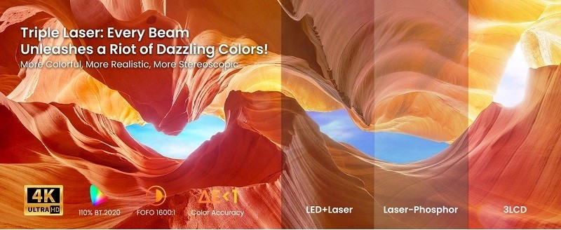 Công nghệ laser 3 màu trên JMGO N1S Infinity 4k sử dụng 3 laser RBG thay vì sử dụng đĩa màu, mang đến khả năng trình chiếu hình ảnh với độ sáng cao, màu sắc rực rỡ, vượt trội so với các công nghệ chiếu sáng trước đây.
