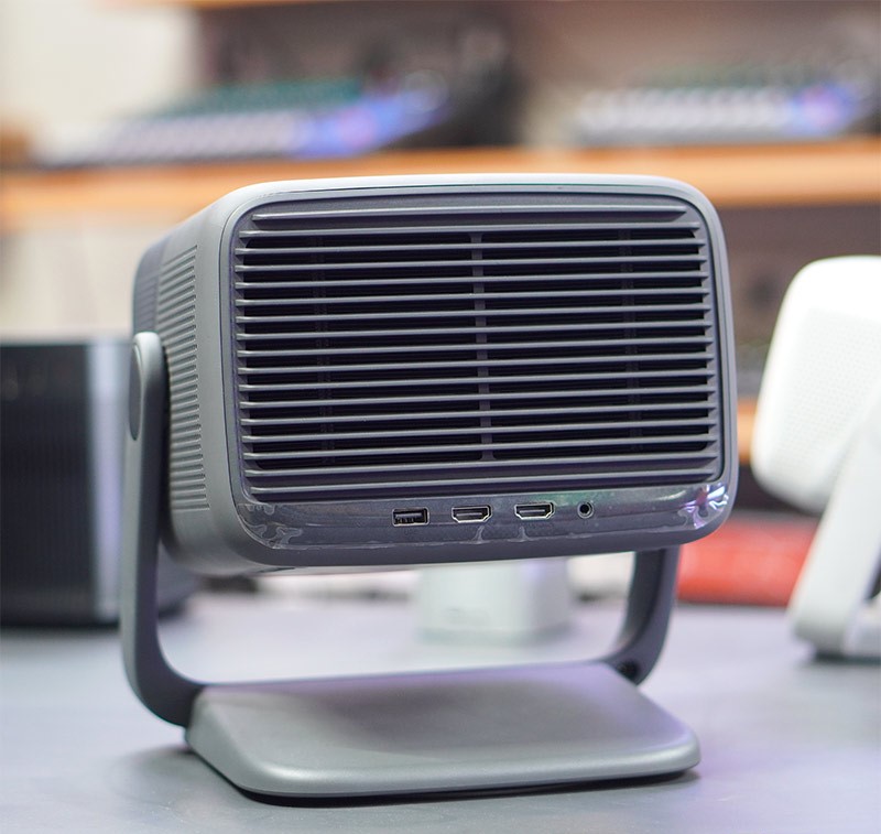 Đặc biệt máy chiếu còn đi kèm với 1 chân xoay gimbal cho phép bạn dễ đàng căn chỉnh góc chiếu thật nhẹ nhàng chỉ với 1 tay. Chân gimbal có khả năng xoay 360 độ theo chiều ngang, hoặc lên xuống 135 độ. Chân đế máy chiếu đã trải qua tới 100.000 bài test độ bền, đảm bảo sự chắc chắn và bền bỉ lâu dài.