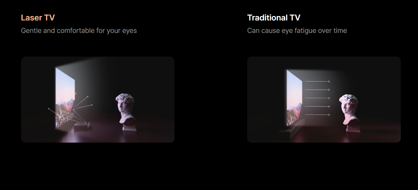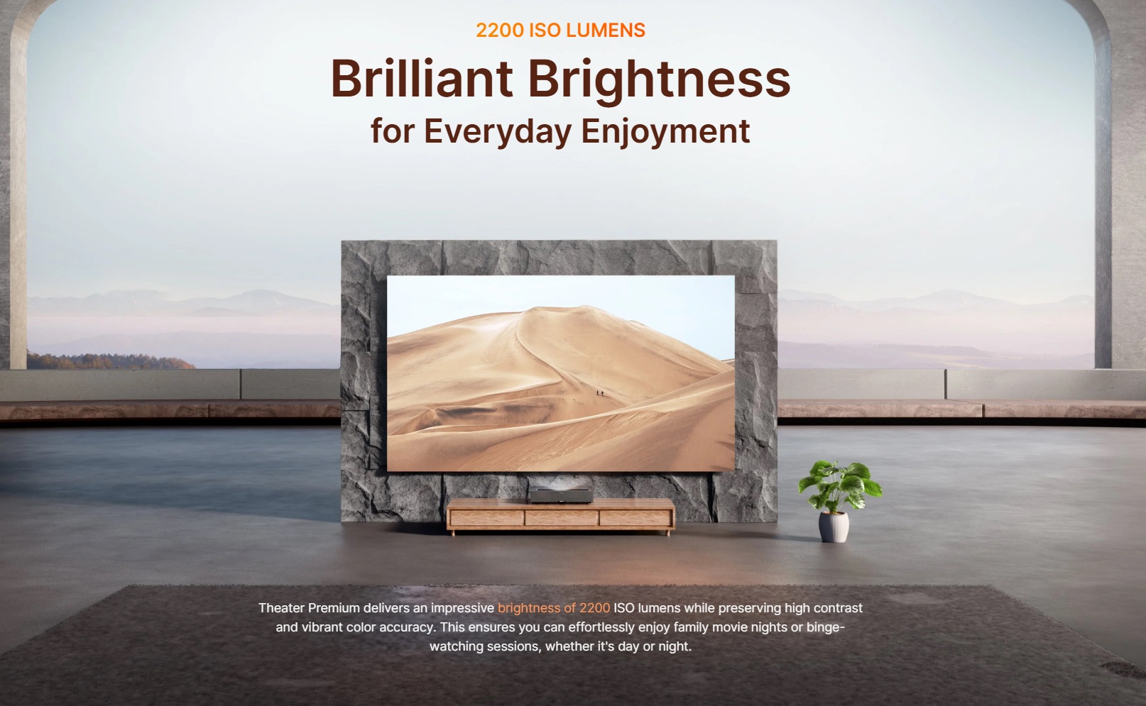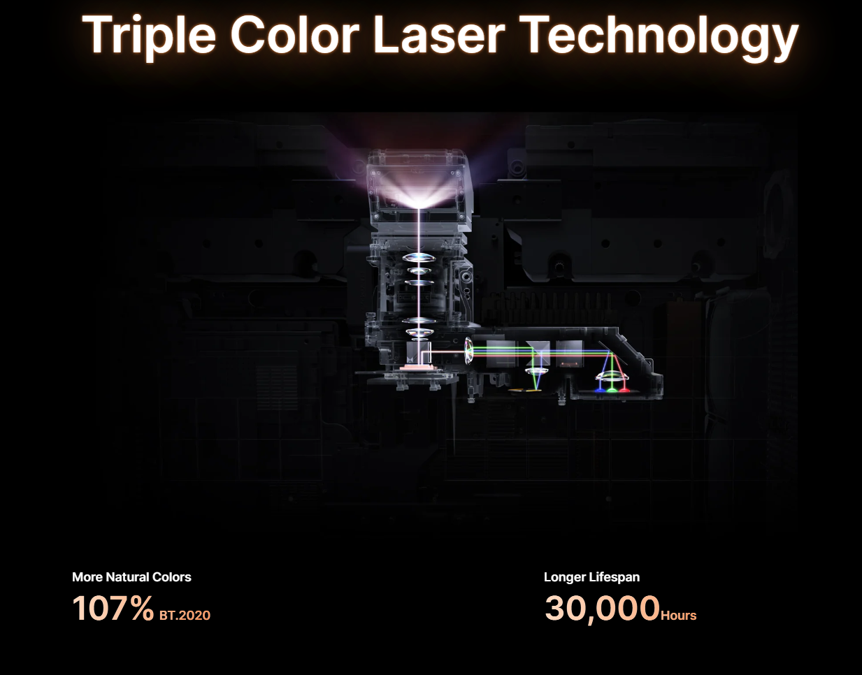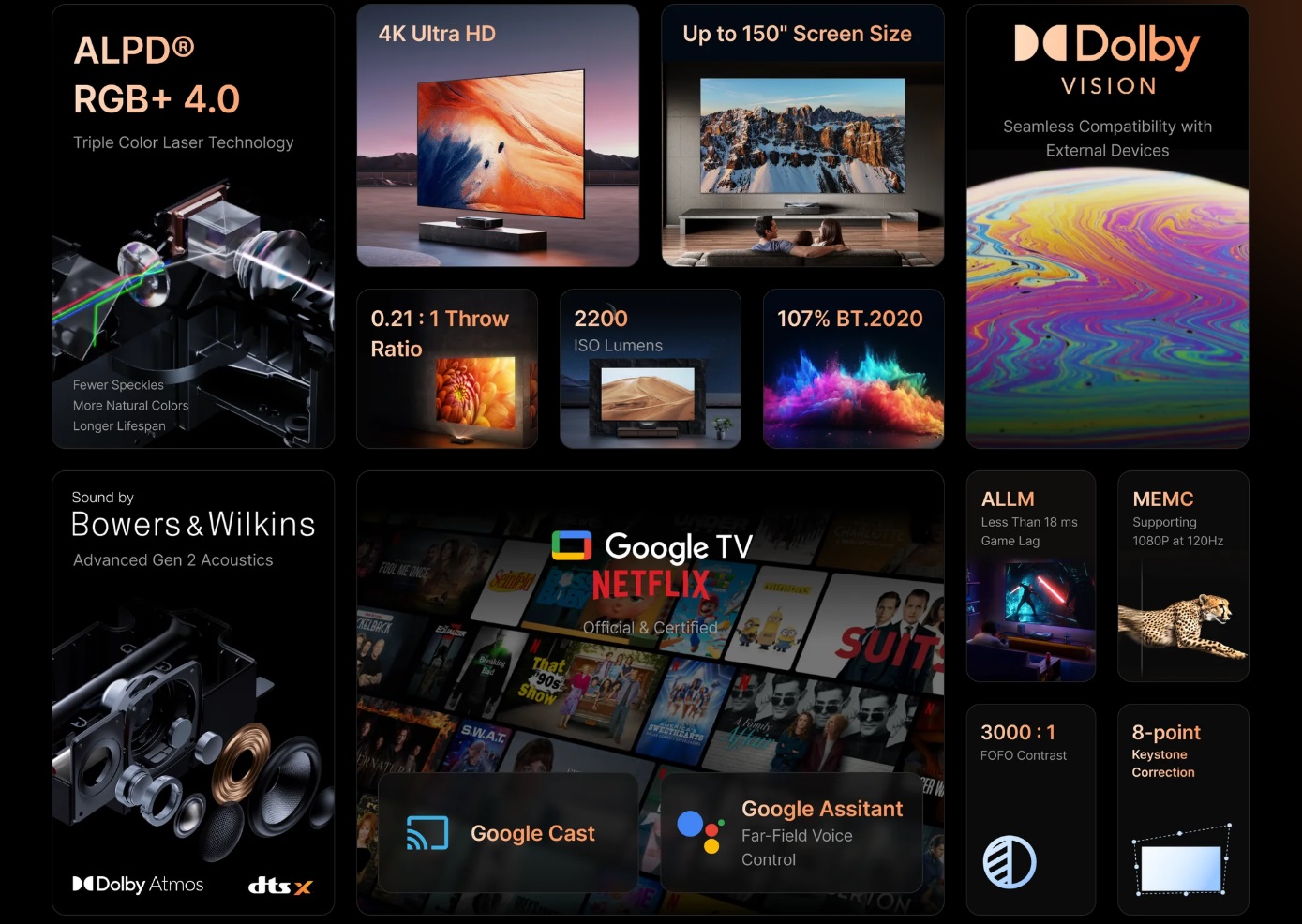 Dòng máy chiếu Formovie Theater Premium Laser TV sử dụng 3 đèn laser RGB cho độ màu đạt chuẩn điện ảnh. máy chiếu được nâng cấp độ sáng lên 2200 Isolumen, tỉ lệ chiếu cực ngắn 0,21:1, loa Bowers & Wilkins (gen 2) điều đáng giá nữa là nó tích hợp Google TV và Netflix chính chủ.