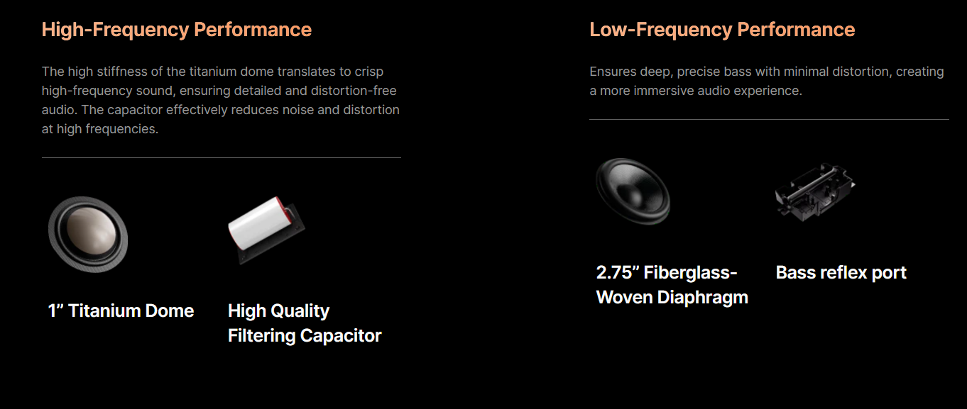 Hệ thống âm thanh có 4 loa, 2 khoang loa 2 bên mỗi khoang lớn 990cc, (có 2 loa tweeter và 2 loa trầm để tách tần số chính xác. Formovie tiếp tục hợp tác với thương hiệu âm thanh uy tín Bowers & Wilkins.