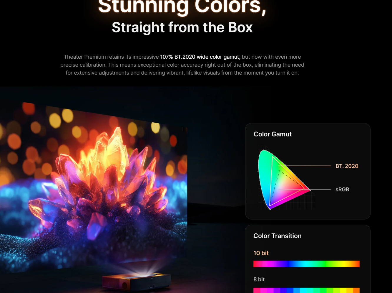 Formovie Theater Premium 4K mang đến màu sắc tuyệt đẹp và độ chính xác màu sắc cao, được hiệu chuẩn ngay từ khi xuất xưởng. Với gam màu rộng 107% BT.2020, máy chiếu tái hiện hình ảnh sống động, chân thực như thật.