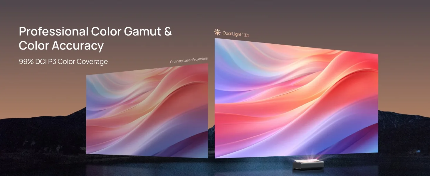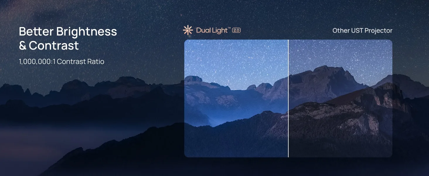 Máy chiếu XGIMI Aura 2 sử dụng công nghệ chiếu sáng kép Dual Light 2.0 tiên tiến, mang lại độ sáng vượt trội lên tới 2300 ISO Lumens, đảm bảo hình ảnh rõ nét, sống động ngay cả trong môi trường ánh sáng phòng khách ban ngày. Cùng với đó là tỷ lệ tương phản 1.000.000:1, mang lại chiều sâu ấn tượng cho từng khung hình, nâng cao trải nghiệm thị giác tổng thể.