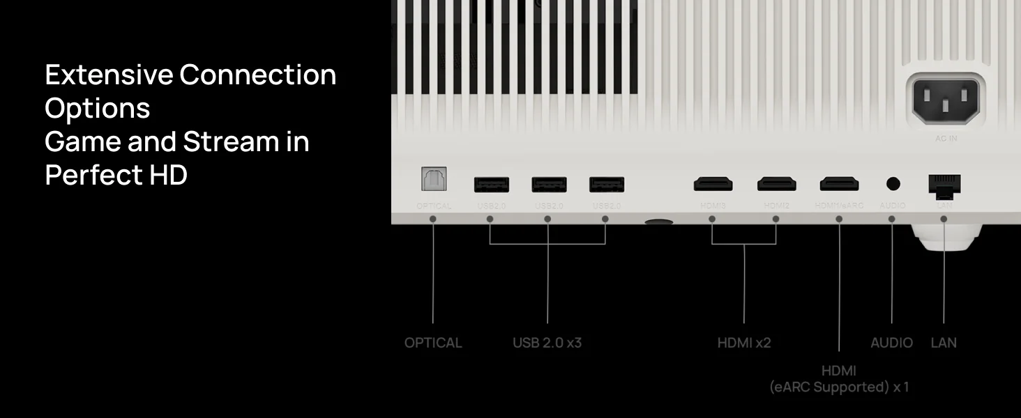 Máy chiếu XGIMI Aura 2 hỗ trợ đầy đủ các chuẩn kết nối hiện đại, bao gồm WiFi 6 và Bluetooth 5.2 cho kết nối không dây nhanh chóng, ổn định. Ngoài ra, thiết bị được trang bị các cổng kết nối có dây như: HDMI x2 (hỗ trợ eARC), USB x3, LAN x1, cổng optical và jack tai nghe 3.5mm, dễ dàng kết nối với nhiều thiết bị ngoại vi…