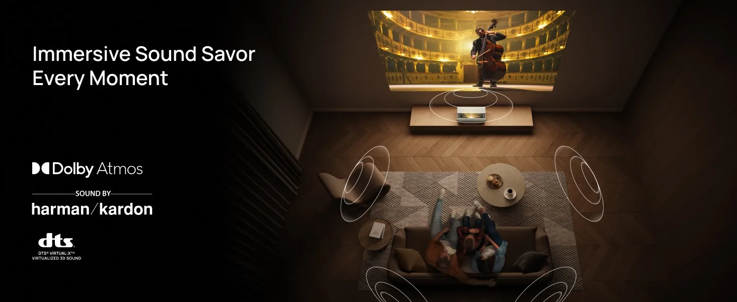 Tích hợp hệ thống loa Harman Kardon công suất 60W cùng công nghệ Dolby Atmos, Máy chiếu XGIMI Aura 2 mang lại trải nghiệm âm thanh vòm 360 độ sống động, với âm cao trong trẻo, âm trầm sâu lắng và giọng thoại rõ ràng. Nhờ chất lượng âm thanh đỉnh cao này, người dùng có thể thưởng thức phim ảnh và âm nhạc ngay lập tức mà không cần đến hệ thống loa ngoài.