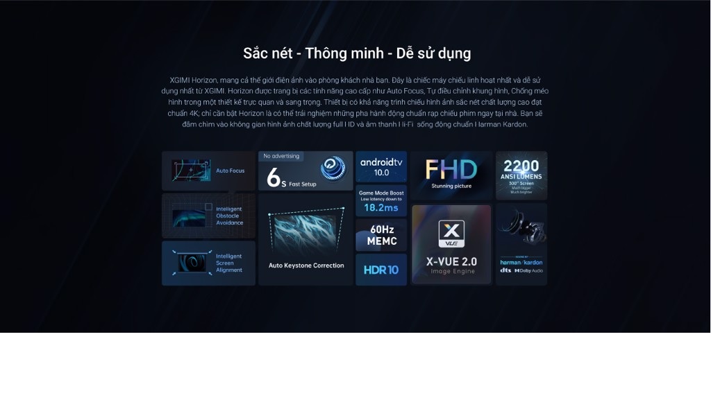 Với Horizon, đây máy chiếu linh hoạt nhất và dễ sử dụng nhất từ XGIMI. Horizon được thiết kế các chức năng cao cấp vào một cách trực quan và hiệu quả. Ngoải khả năng cung cấp những thước phim và hình ảnh với độ phải giải thực sự từ Full-HD đến 4K, XGIMI còn trang bị cho Horizon cũng như nhiều sản phẩm cao cấp khác của hãng hệ thống loa Hi-Fi đến từ tập đoàn danh tiếng thế giới - Harman Kardon. Sự kết hợp của hình ảnh sắc nét và âm thanh sống động sẽ nuông chiều những giác quan của bạn mỗi khi bạn cần thư giãn sau một ngày dài làm việc.