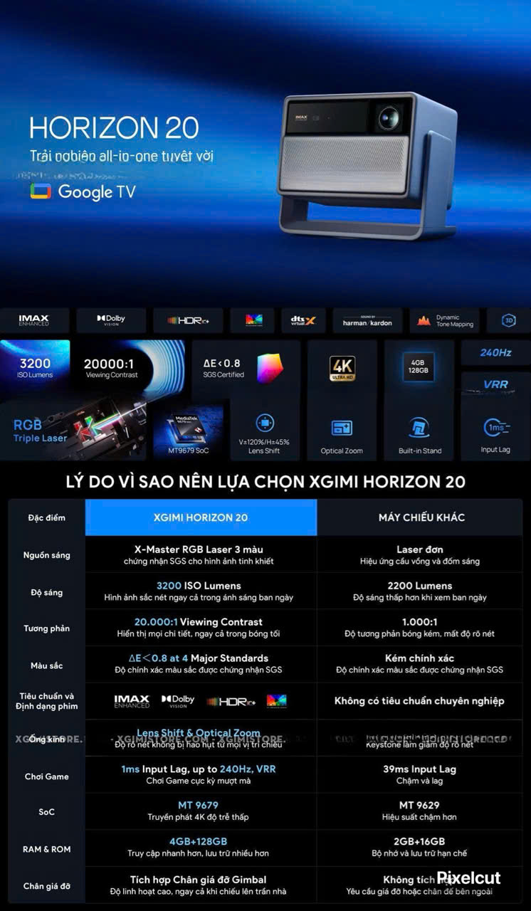 Xgimi vừa chính thức cho trình làng dòng máy chiếu Horizon 20 tại IFA 2025 với 3 phiên bản khác nhau, đánh dấu bước tiến mới trong phân khúc giải trí gia đình với độ sáng vượt trội, khả năng xử lý hình ảnh tinh vi và các tính năng chuyên biệt cho game thủ. Bộ ba sản phẩm bao gồm Horizon 20, Horizon 20 Pro và Horizon 20 Max đều hỗ trợ độ phân giải 4K Ultra HD, chạy hệ điều hành Google TV và có sẵn các ứng dụng phổ biến như Netflix, YouTube cùng nhiều nền tảng phát trực tuyến khác. Trong đó, mã máy Horizon 20 là mã máy chiếu sở hữu thông số độ sáng thấp nhất đạt 3200 ISO Lumens, hỗ trợ sử dụng được đa dạng các kiểu không gian trình chiếu khác nhau.