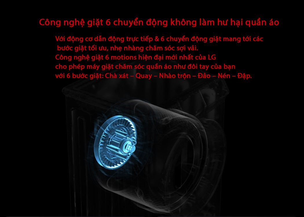 Công nghệ 6 chuyển động DD được mô phỏng quy trình giặt giống như bàn tay con người, cùng với việc kết hợp động cơ truyền động trực tiếp, giúp linh hoạt điều khiển lồng giặt để vừa mang lại hiệu quả giặt sạch, vừa vận hành êm ái, tránh làm ảnh hưởng đến không gian yên tĩnh của gia đình bạn.