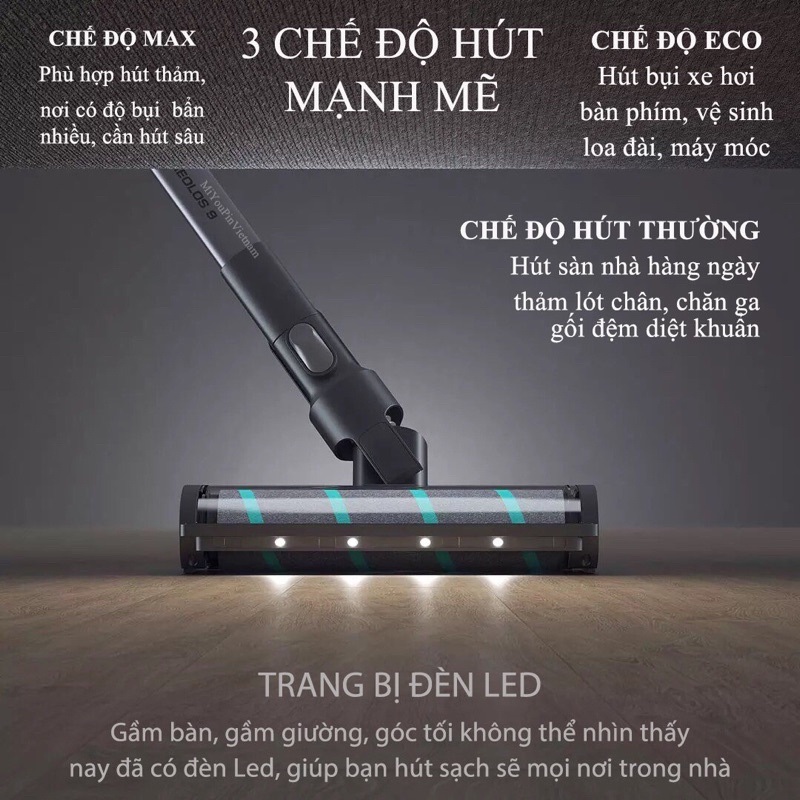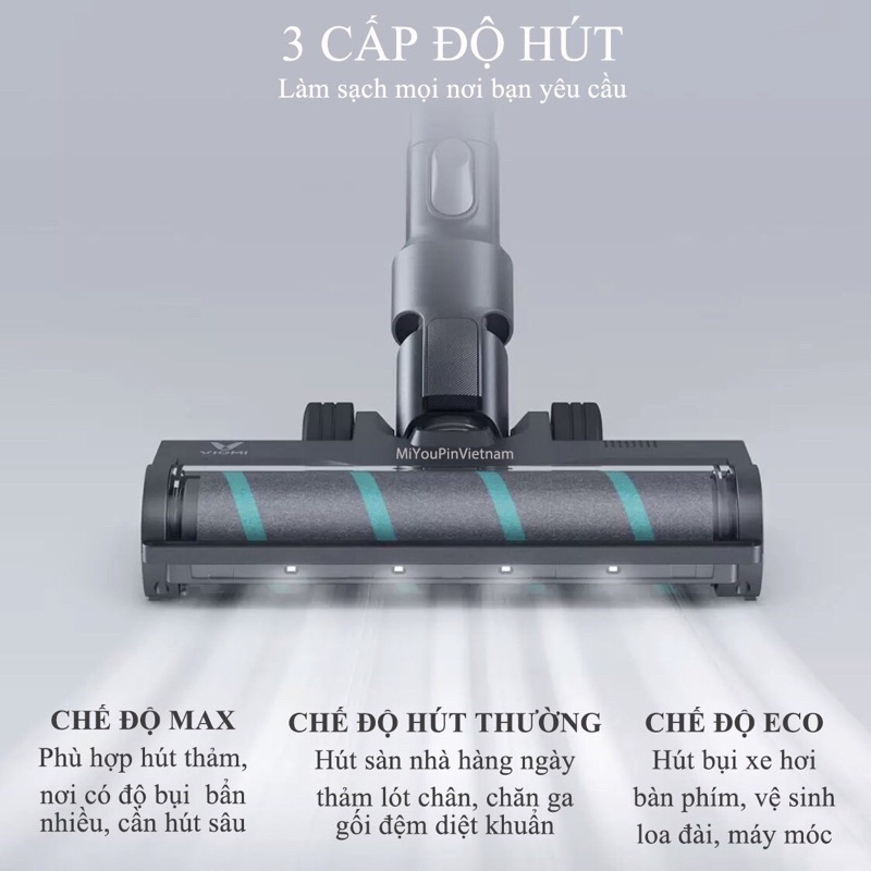 Máy Viomi V9 được trang bị nhiều khớp nối và sử dụng ba mức điều chỉnh lực hút. Chế độ MAX phù hợp với thảm, lông chó mèo và những khu vực bụi bẩn lớn; chế độ tiêu chuẩn phù hợp để loại bỏ bụi sàn hàng ngày, đệm giường sofa; chế độ tiết kiệm năng lượng thích hợp sử dụng trên ô tô, bàn phím …..Dung lượng pin rất lớn, bạn có thể dễ dàng lau dọn căn nhà 150m2 mà vẫn dư điện.