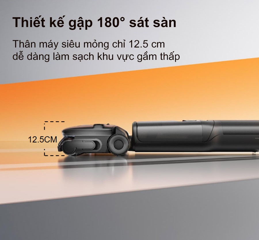 Máy hút bụi lau nhà cầm tay Roborock F25 Ultra được thiết kế linh hoạt với khả năng gập tới 180 độ, chiều cao khi nằm phẳng chỉ 12.5cm. Qua đó giúp thân máy áp sát sàn nhà và dễ dàng luồn lách vào những không gian thấp như gầm giường, gầm sofa hay tủ kệ. Đây là giải pháp lý tưởng cho việc làm sạch triệt để các khu vực thường bị bỏ sót trong quá trình dọn dẹp thông thường.