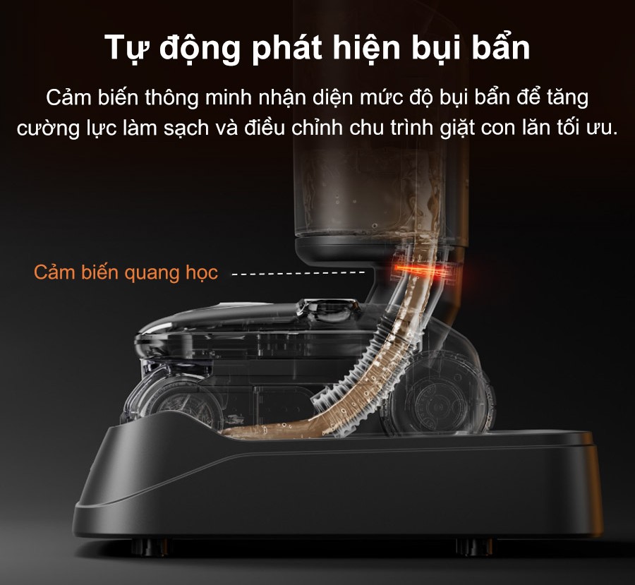 Máy hút bụi lau nhà Roborock F25 Ultra tích hợp cảm biến quang học hiện đại, giúp phát hiện chính xác mức độ bụi bẩn trên mặt sàn và con lăn. Dựa trên dữ liệu này, máy sẽ tự động điều chỉnh cường độ làm sạch và thời gian giặt con lăn, đảm bảo vệ sinh tối ưu mà không gây hao phí điện năng hay nước. Nhờ đó, mọi khu vực đều được làm sạch kỹ lưỡng mà bạn không cần phải can thiệp thủ công.
