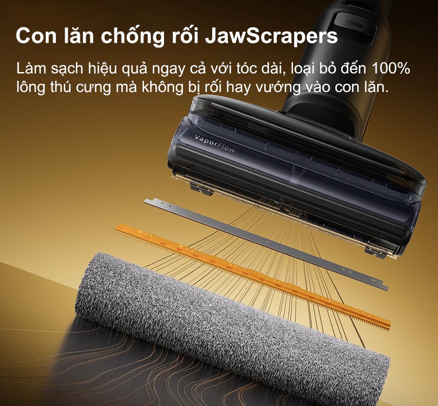 Với hệ thống JawScrapers thông minh, Roborock F25 Ultra giải quyết triệt để tình trạng tóc và lông thú quấn vào con lăn. Công nghệ này giúp loại bỏ 100% tóc dài và lông vật nuôi, giữ cho con lăn luôn sạch sẽ, không bị tắc nghẽn hay giảm hiệu suất như các dòng máy hút bụi thông thường. Đây là tính năng đặc biệt hữu ích cho các gia đình có nuôi thú cưng.