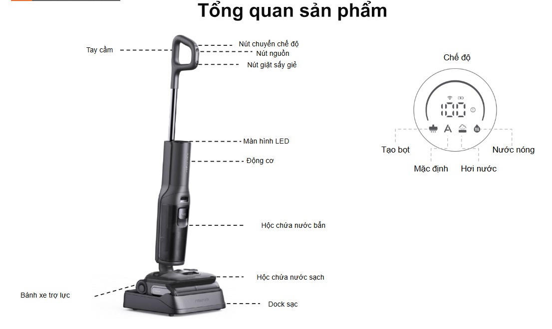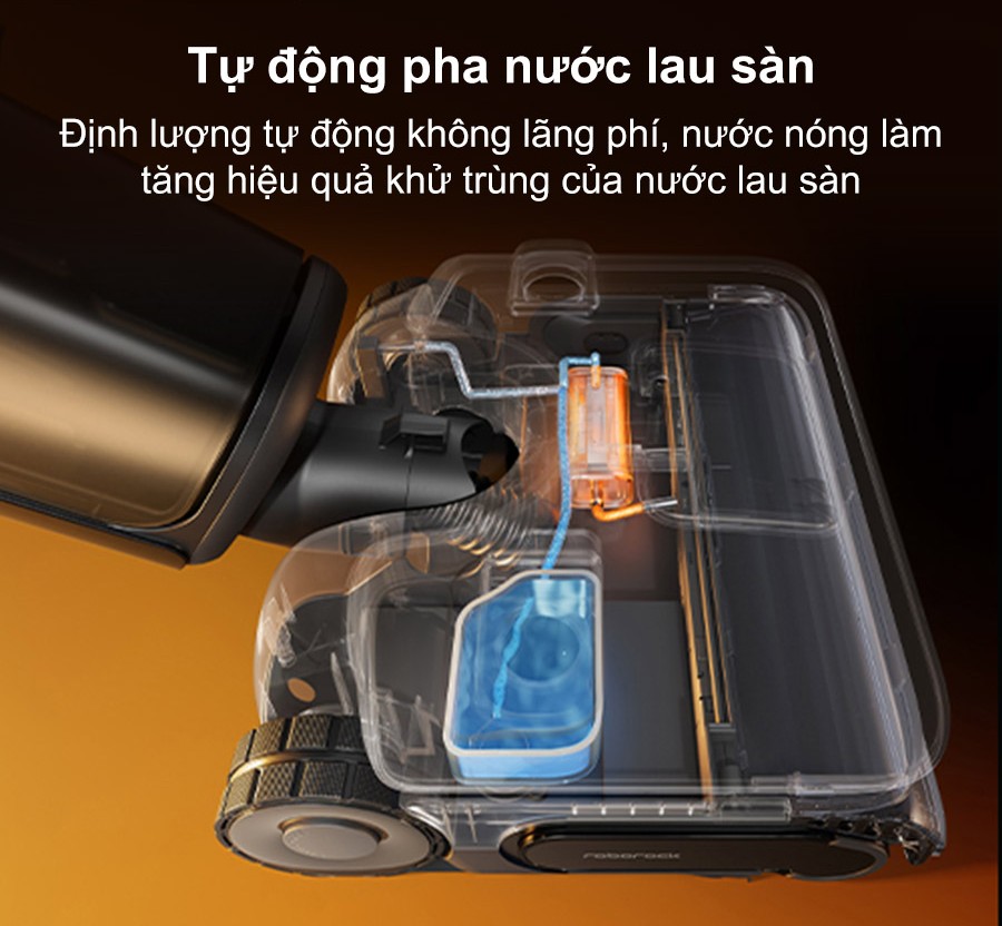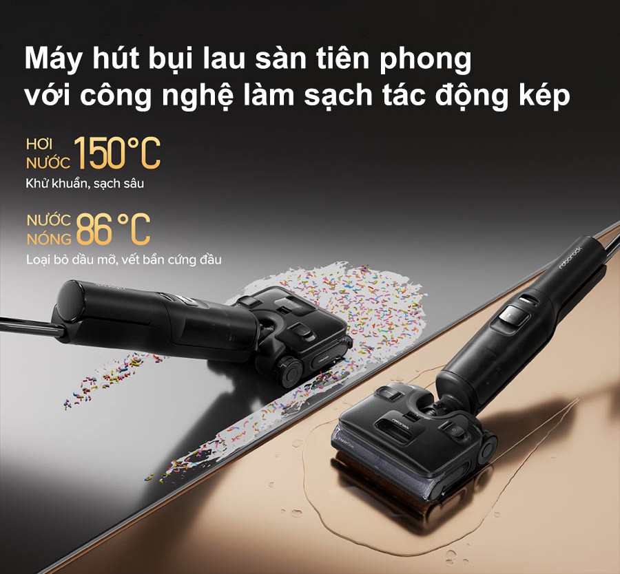 Không chỉ dừng lại ở nước nóng, Roborock F25 Ultra còn được trang bị chế độ làm sạch bằng hơi nước hiện đại. Máy bắt đầu tạo hơi chỉ sau 1 phút khởi động, với mô đun làm nóng đạt tới 150°C. Tại đầu phun hơi, nhiệt độ hơi nước lên tới 99°C, giúp tiêu diệt vi khuẩn và loại bỏ bụi bẩn một cách mạnh mẽ. Trong khi đó, bề mặt sàn sau khi lau được duy trì ở mức nhiệt khoảng 70°C, vừa đảm bảo hiệu quả làm sạch, vừa an toàn cho sàn nhà và người sử dụng.