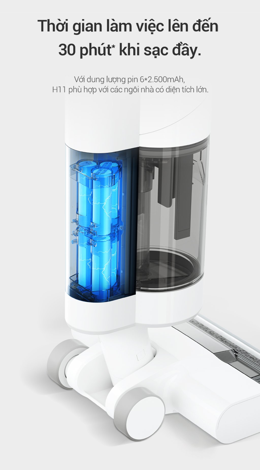 Dreame H11 sở hữu động cơ không chổi than với lực hút mạnh mẽ lên đến 5500 Pa. Động cơ chổi lăn độc lập tốc cho tốc độ lên đến 9300 vòng/phút. Bên trong, Dreame thiết kế vách ngăn cách hộp nước sạch và hộp nước bẩn để đảm bảo hiệu quả và vệ sinh. Dung tích hộp chứa nước sạch là 900ml. Công suất 170W với pin 6*2500mAh cho thời gian sử dụng lên đến 30 phút liên tục, diện tích lau dọn lên đến 160m2