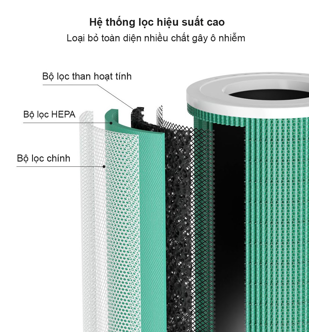 Đặc biệt là sự kết hợp của 3 lớp lọc là bộ lọc chính, bộ lọc HEPA và than hoạt tính chất lượng cao. Cụ thể, bộ lọc chính cho hiệu quả loại bỏ bụi bẩn, lông tóc, các hạt mịn và lớn khác nhau. Bộ lọc HEPA cho hiệu quả lọc sạch đến 99.98% các hạt PM2.5 có đường kính bằng hoặc lớn hơn 0.3μm và các mầm bệnh như vi khuẩn, vi rút, các chất gây dị ứng. Cuối cùng, bộ lọc than hoạt tính chất lượng cao giúp hấp thụ formaldehyde, các hợp chất hữu cơ dễ bay hơi (TVOC) và các khí độc hại khác, đồng thời khử mùi hôi hiệu quả.