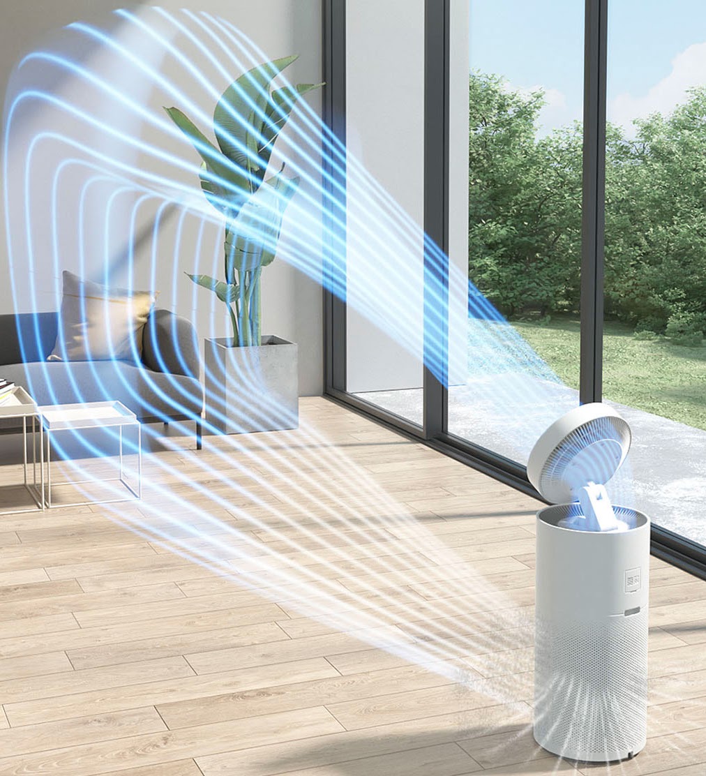 Bên cạnh chức năng lọc sạch không khí, sản phẩm còn được tích hợp quạt làm mát, hỗ trợ tạo gió và lưu thông không khí trong nhà. Theo đó, máy có thể đẩy không khí sạch đã được lọc ra xa 8m nhờ vào công nghệ không khí tuần hoàn. Hơn nữa, người dùng cũng có thể điều chỉnh góc nghiêng trên dưới của quạt ở mức 0°, 45° và 85° tùy theo nhu cầu sử dụng.