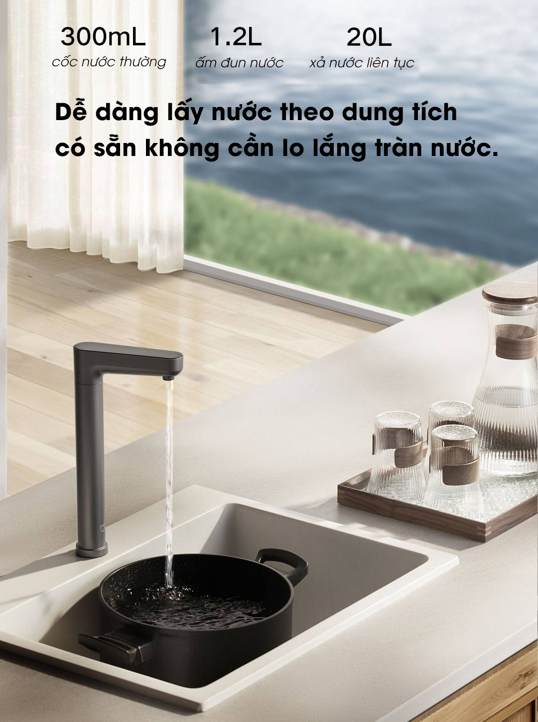 Máy lọc nước 1000G Pro của Xiaomi cho phép dễ dàng chọn ba mức thể tích nước phổ biến, phù hợp với cả cốc lớn và cốc vừa. Chế độ “lấy tự động” giúp bạn lấy nước mà không cần phải theo dõi, giúp tiết kiệm thời gian và không bị ảnh hưởng khi làm các việc khác.
