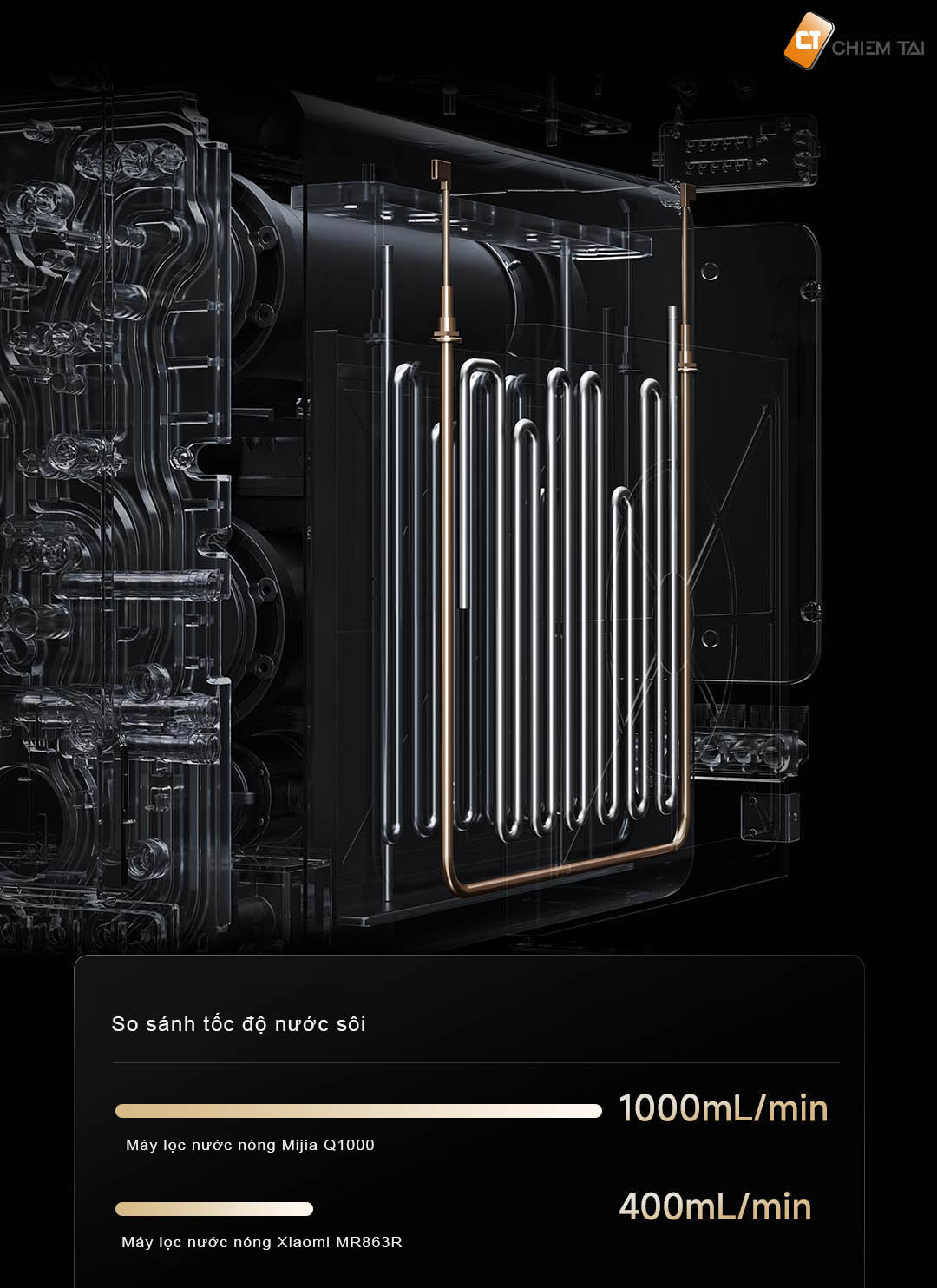 Máy lọc nước Xiaomi Mijia Q1000 được tích hợp công nghệ làm nóng nước tức thì, có thể làm nóng nước ngay lập tức khi đang chảy với tốc độ đun sôi nước tăng 150% với lưu lượng tối đa 1000ml/phút. Công nghệ này cho phép máy đun sôi nước ngay thời gian thực, không cần phải đun đi đun lại và lưu trữ, cung cấp nước nóng tinh khiết và sạch cho mọi nhu cầu và bất cứ khi nào người dùng cần