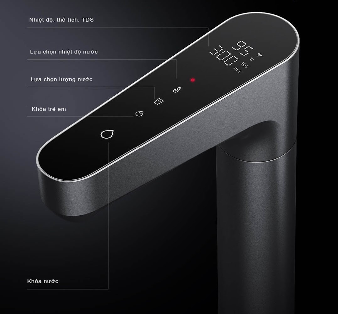 Vòi nước của máy lọc nước RO này là loại vòi nước điện tử, được tích hợp một màn hình hiển thị với các khu vực tùy chỉnh bằng cảm ứng. Màn hình đảm nhiệm vai trò hiển thị những thông số thực tế của nước như nhiệt độ nước, chọn lượng nước và hiển thị giá trị TDS... giúp người dùng có thể dễ dàng tùy chỉnh và sử dụng. Ngoài ra, vòi nước cũng có thể được xoay linh hoạt để có thể lấy nước thoải mái từ nhiều góc độ.