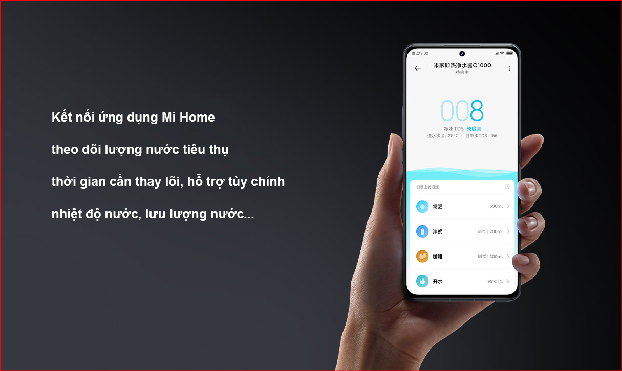 Máy nước nóng Xiaomi Mijia Q1000 còn được tích hợp sẵn 4 chế độ nước gồm nhiệt độ thường, sữa, cà phê và nước sôi cho người dùng có thể tùy chọn nước nhanh chóng và tiện lợi hơn trong quá trình sử dụng. Ngoài ra, máy cũng được hỗ trợ điều chỉnh nhiệt độ theo từng 1°C từ 40°C đến 95°C, đáp ứng tốt cho mọi nhu cầu sử dụng nước trong cuộc sống hằng ngày từ nấu ăn, phà trà, pha sữa,...đến nước uống.